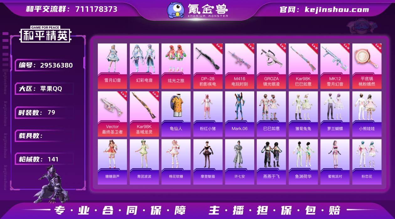 苹果 手Q-3粉装-8特效枪-0载具-1粉色飞行器-43638热力值-5王牌印记-79套装-141枪皮 【热门品类】:套装-龟仙人,套装-粉红小猪,角色-Mark.06 【粉色套装】:粉装-炫光之旅,粉装-雪月幻音,粉装-幻彩电音 【粉色枪皮等级】:M416-电玩时刻(五级),GROZA-镜光银凌(五级),Vector-最终圣卫者(三级),Kar98K-巳巳如意(五级),Kar98K-圣域龙灵(三级),MK12-雪月幻音(四级),DP-28-豹影疾电(五级),平底锅-桃粉嫣然(四级) 【粉色枪皮】:M416-电玩时刻,GROZA-镜光银凌,Vector-最终圣卫者,Kar98K-巳巳如意,Kar98K-圣域龙灵,MK12-雪月幻音,DP-28-豹影疾电,平底锅-桃粉嫣然 【粉色飞行器】:圣域金龙飞行器 【粉色降落伞】:梦幻火箭降落伞,星夜魔法师降落伞,暗夜鎏金降落伞,蜜语绒猫降落伞,镜域双华降落伞,精灵梦叶罗丽降落伞,金丰海韵降落伞,时空协奏降落伞,千金淑猫降落伞,临安公主降落伞,桃粉嫣然降落伞,雪月幻音降落伞,圣域龙灵降落伞,智耀战神降落伞,星穹咏叹调降落伞,最终圣卫者降落伞 【稀有套装】:套装-龟仙人,套装-巳巳如意,套装-雏菊兔兔,套装-萝兰蝴蝶,套装-小熊娃娃,套装-糖糖葫芦,套装-青团波波,套装-棉花软糖,角色-摩登魅猫,角色-许七安,套装-燕燕于飞,套装-鱼渊荷华,角色-蜜桃派对,套装-粉恋花,套装-紫幽梦,套装-蓝冰羽,套装-星影赞美诗,套装-霓虹热舞,套装-彩虹兔,套装-云朵鹅,套装-雪绒豹 【稀有枪皮】:AKM-彩虹符号,AKM-江南烟雨,SCAR-L-炫彩节奏,M416-蓝色火焰,GROZA-田园牧歌,AUG-天降萌叽,M762-彩虹符号,M762-云朵鹅,G36C-桃粉嫣然,AC-VAL-天降萌叽,蜜獾-天降萌叽,Famas-桃粉嫣然,UZI-天降萌叽,UMP45-夜灯,UMP45-蓝色火焰,Vector-焰鹰斗篷,Vector-田园牧歌,Vector-创世·救赎,汤姆逊-天降萌叽,野牛-最终圣卫者,P90-巳巳如意,Kar9...