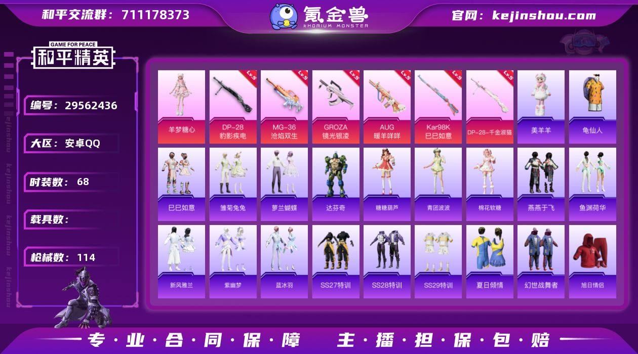 安卓 手Q-1粉装-6特效枪-0载具-0粉色飞行器-30466热力值-2王牌印记-68套装-114枪皮 【热门品类】:套装-龟仙人 【粉色套装】:角色-羊梦糖心 【粉色枪皮等级】:GROZA-镜光银凌(五级),AUG-暖羊咩咩(五级),Kar98K-巳巳如意(五级),DP-28-千金淑猫(五级),DP-28-豹影疾电(五级),MG-36-沧焰双生(五级) 【粉色枪皮】:GROZA-镜光银凌,AUG-暖羊咩咩,Kar98K-巳巳如意,DP-28-千金淑猫,DP-28-豹影疾电,MG-36-沧焰双生 【粉色降落伞】:精灵梦叶罗丽降落伞,临安公主降落伞,星穹咏叹调降落伞,喜羊羊与灰太狼降落伞 【稀有套装】:套装-龟仙人,套装-巳巳如意,套装-雏菊兔兔,套装-萝兰蝴蝶,角色-达芬奇,套装-糖糖葫芦,套装-青团波波,套装-棉花软糖,套装-燕燕于飞,套装-鱼渊荷华,套装-新风雅兰,套装-紫幽梦,套装-蓝冰羽,玩偶服-美羊羊 【稀有枪皮】:AKM-影袭,AKM-破晓战魂,M16A4-幻世战舞者,M16A4-红色方程式,SCAR-L-夜灯,M416-红色方程式,AUG-耀粉歌者,QBZ-彩虹符号,蜜獾-天降萌叽,UZI-天降萌叽,UZI-红色方程式,UMP45-夜灯,UMP45-蓝色火焰,汤姆逊-耀粉歌者,P90-巳巳如意,SKS-糯团青竹,VSS-彩虹符号,Mini14-耀粉歌者,AMR-喜羊羊与灰太狼,S686-巳巳如意,S12K-玩趣呆呆,S12K-破晓战魂,S12K-夜灯,S12K-幻世战舞者,M249-彩虹符号,DP-28-彩虹符号,MG3-幻世战舞者,爆炸猎弓-雪月幻音,大砍刀-鬼刀,撬棍-沙丘之主权杖,破片手榴弹-巳巳如意 【其他套装】:套装-SS27特训,套装-SS28特训,套装-SS29特训,套装-夏日倾情,套装-幻世战舞者,套装-旭日情侣,套装-极速红龙,套装-海岛探路者,套装-滨海厨神,套装-猛禽,套装-甜蜜告白,套装-白色伏地魔,套装-破晓战魂,套装-破蛋小黄鸡,套装-竞技名士,套装-绮丽涂鸦,套装-缤纷果语,套装-耀眼新星,套装-耀粉歌者,套装-都市魅...