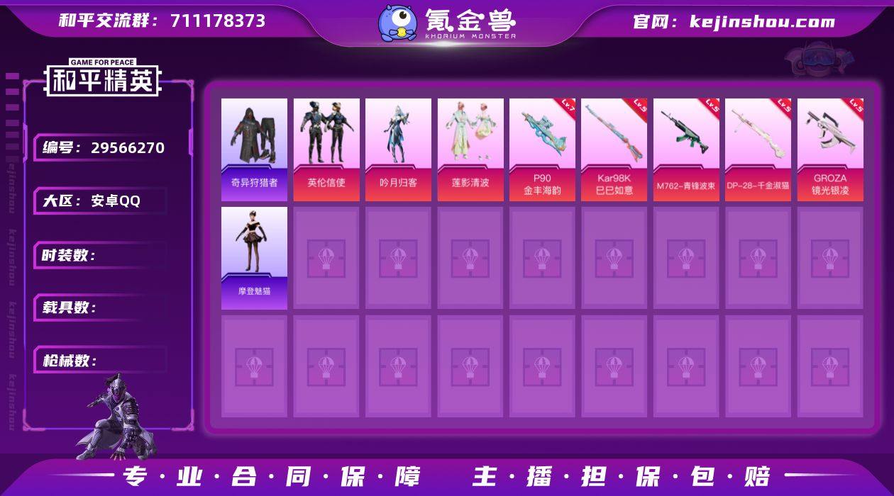 【新年亏本出售!可秒换绑】【4粉装-7粉枪-0载具-3珍稀飞行器-131套装-221枪皮】热力值:61554 历史最高段位:超级王牌12星 王牌印记:15 卓越印记:1 Lv:65【稀有资产】套装-奇异狩猎者/套装-龟仙人/角色-摩登魅猫 【粉色套装】套装-吟月归客/套装-莲影清波/套装-英伦信使/角色-智耀战神 【粉色枪皮】P90-金丰海韵[7级]/GROZA-镜光银凌[5级]/M762-青锋波束[5级]/Kar98K-巳巳如意[5级]/DP-28-千金淑猫[5级]/DP-28-豹影疾电[5级]/平底锅-喜羊羊与灰太狼[2级] 【飞行器】深渊漩涡飞行器/牡丹亭?游园飞行器/冠军兔兔飞行器