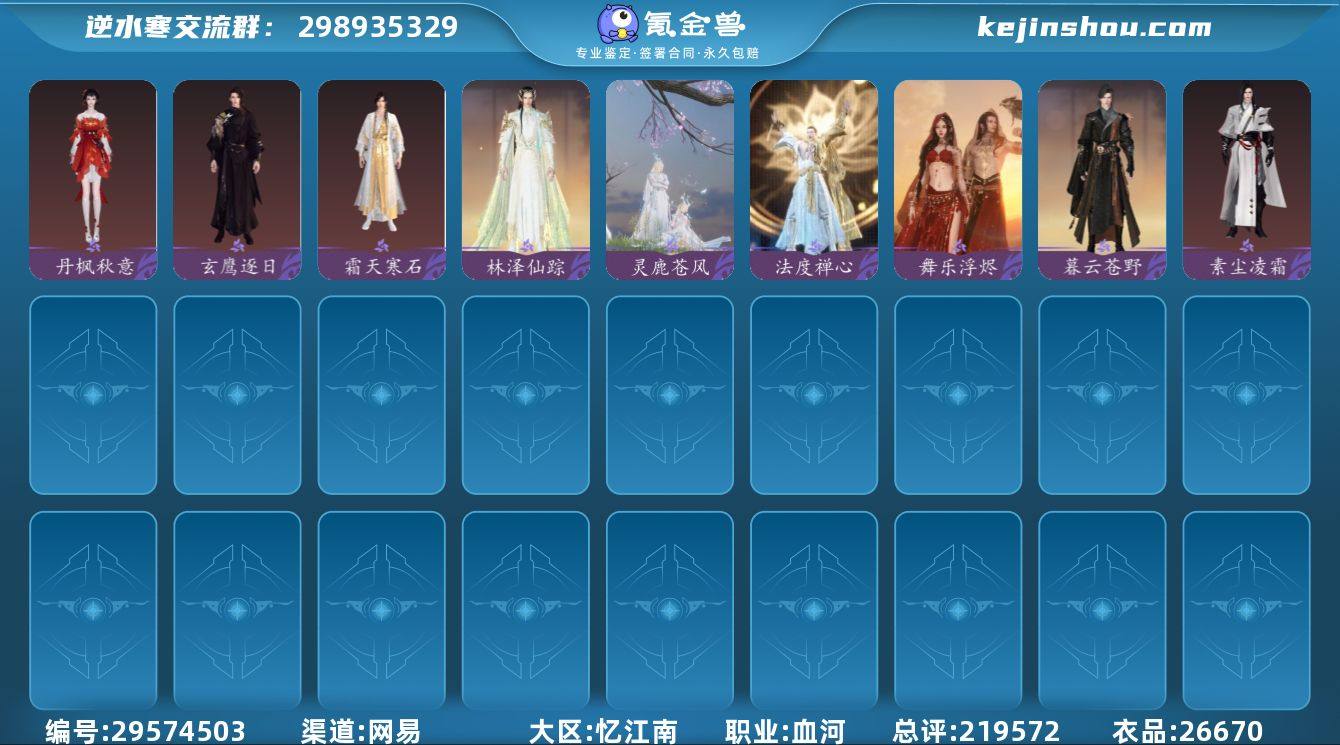 网易支付状态:可注销 换绑冷却:无冷却 职业:血河 总评:219572 衣品:26670 丹枫秋意,玄鹰逐日,霜天寒石,林泽仙踪,灵鹿苍风,法度禅心,舞乐浮烬,暮云苍野,素尘凌霜 轩辕,木小马