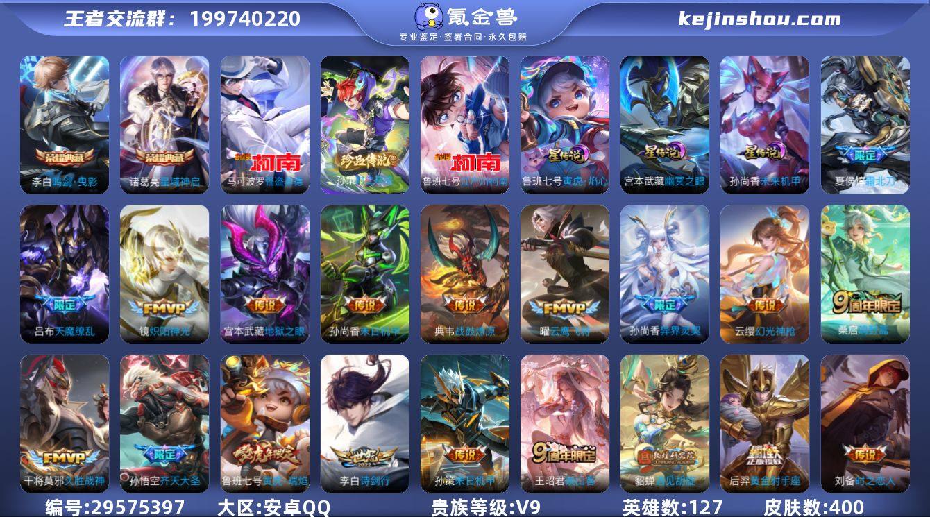 v9 400皮 20赛季印记 传奇王者印记怪盗基德柯南等,二典藏诸葛李白,荣耀水晶三百抽,才改实名,因此暂时改不了实名