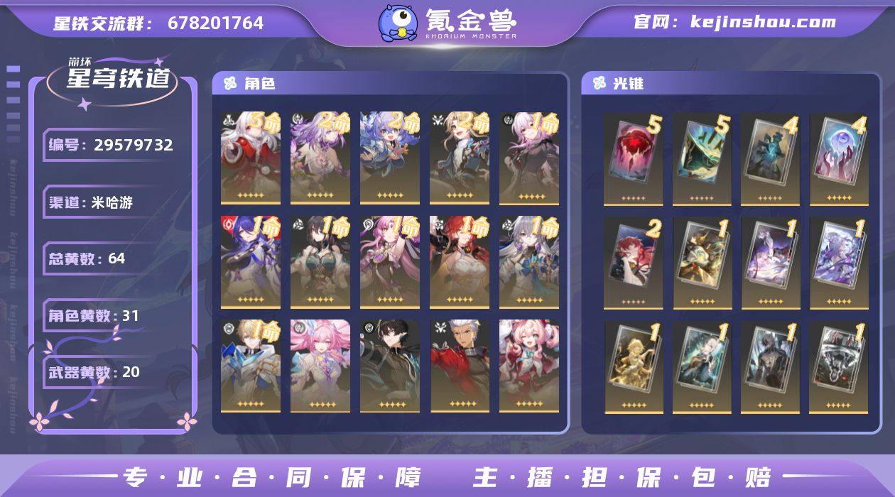 总黄数: 59 0命昔涟 3命金色角色: 3命克拉拉 2命金色角色: 2命彦卿,2命白露,2命遐蝶 1命金色角色: 1命姬子,1命布洛妮娅,1命杰帕德,1命符玄,1命阮•梅,1命黄泉1命长夜月, 0命金色角色: 0命希儿,0命瓦尔特,0命罗刹,0命刃,0命卡芙卡,0命丹恒•饮月,0命镜流,0命藿藿,0命真理医生,0命黑天鹅,0命波提欧,0命流萤,0命椒丘,0命乱破,0命星期日,0命阿格莱雅,0命风堇,0命Archer,0命丹恒·腾荒 精5武器: 精5记一位星神的陨落,精5星海巡航 精4武器: 精4孤独的疗愈 精2武器: 精2银河铁道之夜 精1武器: 精1拂晓之前,精1时节不居,精1制胜的瞬间,精1但战斗还未结束,精1无可取代的东西,精1到不了的彼岸,精1此身为剑,精1镜中故我,精1行于流逝的岸,精1驶向第二次生命,精1梦应归于何处,精1将光阴织成黄金,精1让告别,更美一些,致长夜的星光