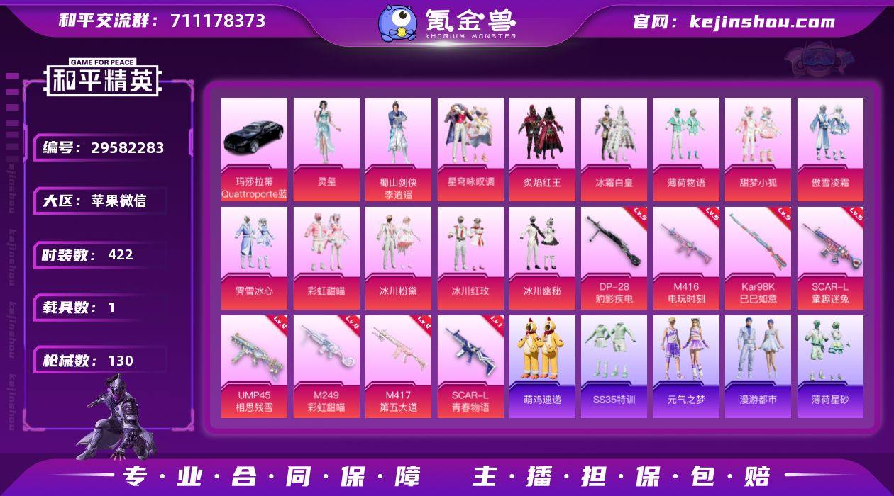 HY 微区质量女号 实名: 可修改 时装数: 422 载具数: 1 枪械数: 130 战备数: 87 热门装扮: 梦魇先生,炙焰红王,冰霜白皇,薄荷物语,甜梦小狐,傲雪凌霜,霁雪冰心,彩虹甜喵,蜀山剑侠-李逍遥,冰川粉黛,冰川红玫,冰川幽秘,恶魔喵喵,星穹咏叹调,灵玺 载具: 玛莎拉蒂Quattroporte(夜幕蓝) 稀有枪皮: SCAR-L童趣迷兔,UMP45相思残雪,SCAR-L青春物语,M249彩虹甜喵,M417第五大道,M416电玩时刻,Kar98K-巳巳如意,DP-28-豹影疾电