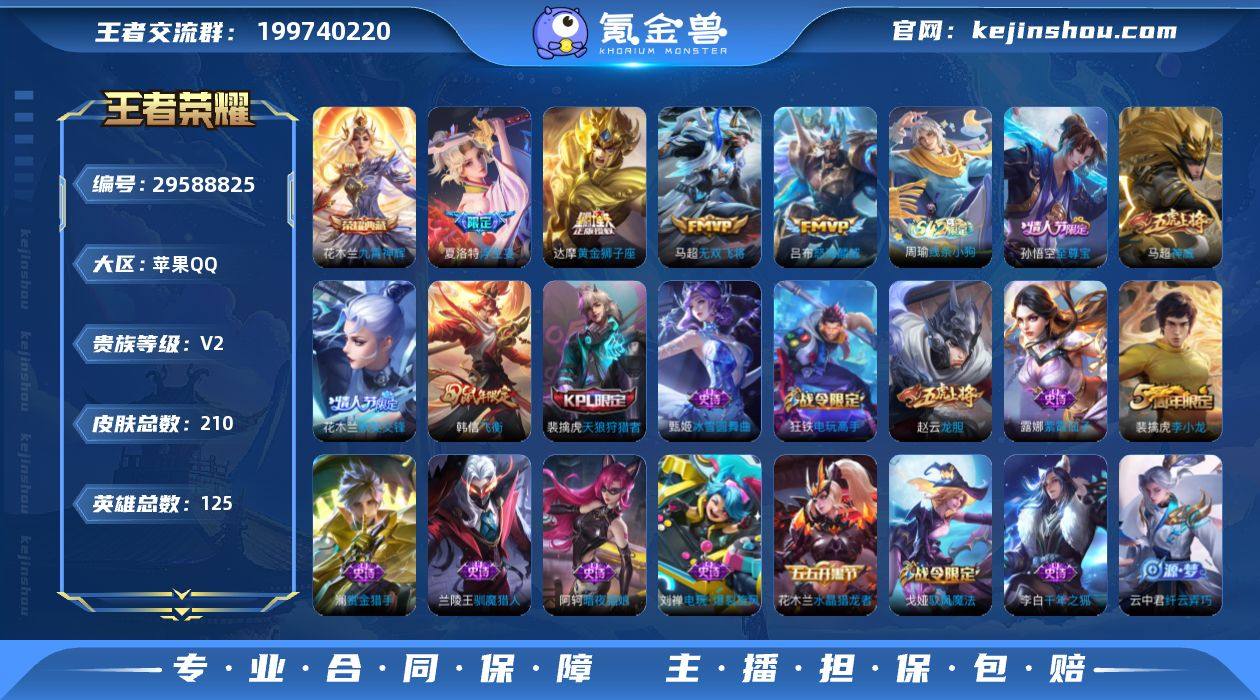 实名: 可修改 贵族等级: V2 英雄数: 125 皮肤数: 210 荣耀水晶: 九霄神辉 传说皮: 黄金狮子座,无双飞将,浮生妄 限定皮: 李小龙,梁祝,龙胆,神威,飞衡,天狼狩猎者,至尊宝,默契交锋-花木兰,怒海麟威