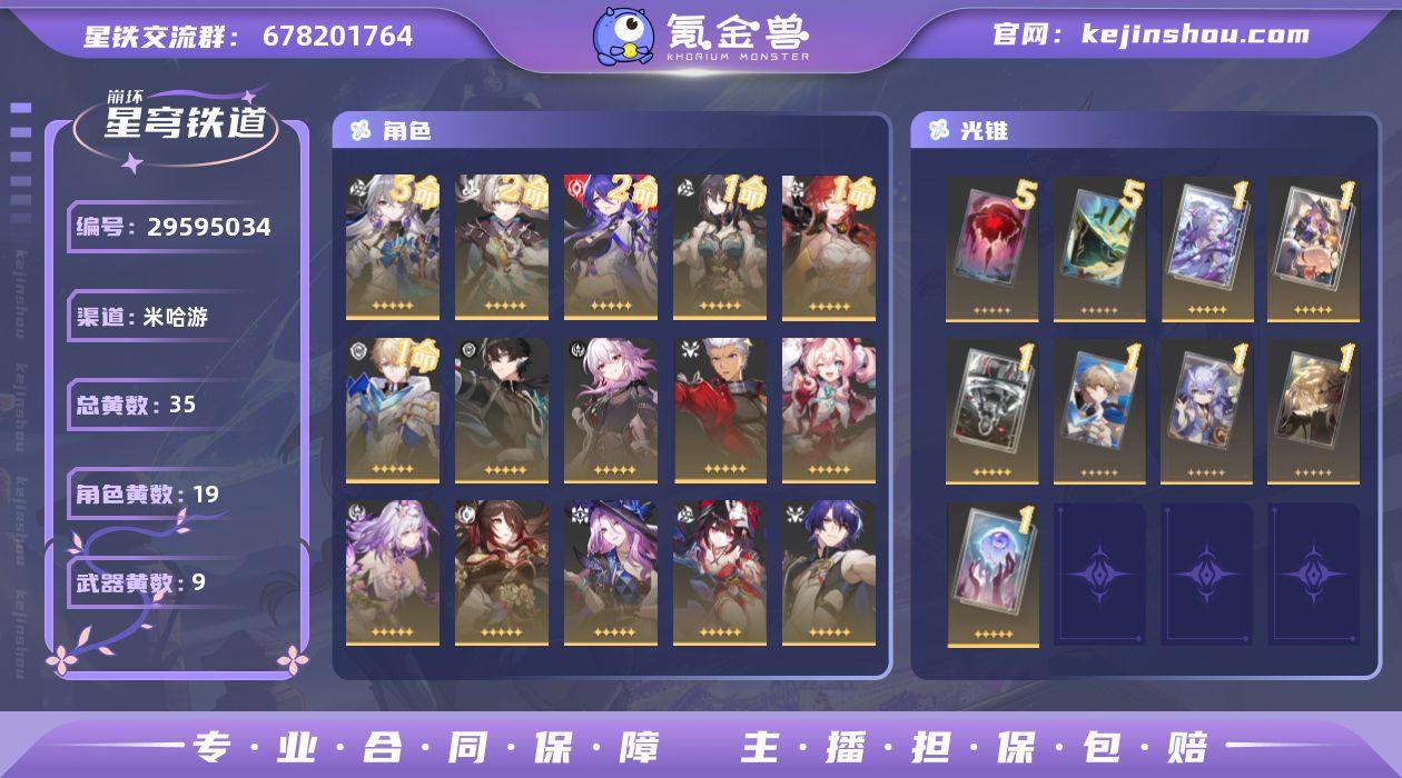 总黄数: 35 3命金色角色: 3命布洛妮娅 2命金色角色: 2命黄泉,2命流萤 1命金色角色: 1命姬子,1命杰帕德,1命阮•梅 0命金色角色: 0命白露,0命瓦尔特,0命克拉拉,0命符玄,0命真理医生,0命花火,0命翡翠,0命忘归人,0命遐蝶,0命风堇,0命Archer,0命长夜月,0命丹恒·腾荒 精5武器: 精5记一位星神的陨落,精5星海巡航 精1武器: 精1时节不居,精1如泥酣眠,精1制胜的瞬间,精1行于流逝的岸,精1偏偏希望无价,精1记忆永不落幕,精1让告别,更美一些