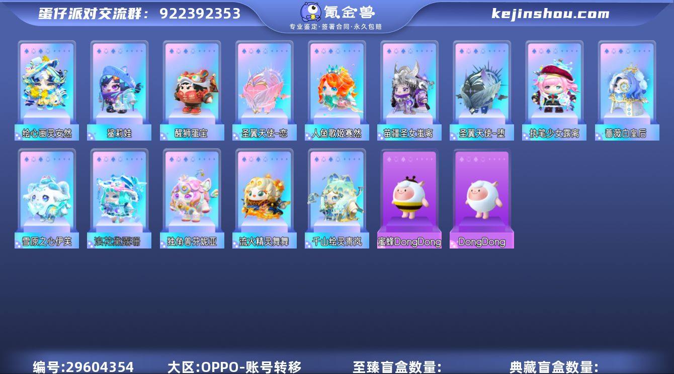 绘心画灵安然,独角兽芬妮亚,浪花黛露珊,流火精灵舞舞,苗疆圣女蚩离,千山绘灵青岚,蔷薇白皇后,人鱼歌姬赛然,鲨莉娃,圣翼天使-堕,圣翼天使-恋,醒狮蛋宝,雪原之心伊芙,执笔少女露离 段位:五阶鸵鸟蛋 卖家说:15至臻98紫皮4车4滚动特效,15w+潮流度。11.14日新赛季盲盒已抽,120抽至臻,呦会员还有68天,彩虹币还有75个。艾比有13只隐藏,很多普通异色。截图是之前的,现在氪条超2w,大半是代s。11.11封赠,号里还有283蛋币,不影响自玩