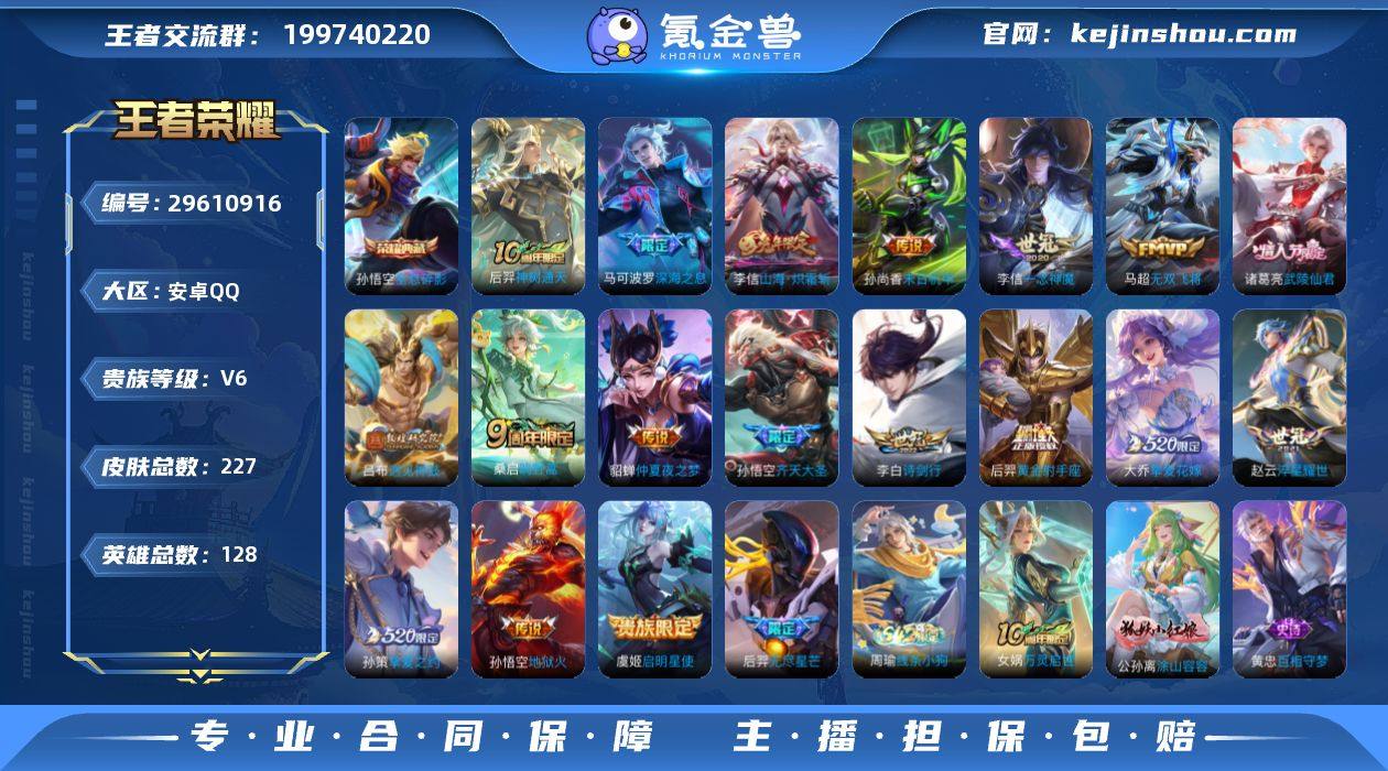 账号亮点:李信全皮 孙悟空全息碎影 后羿神树通天,桑启鸣野蒿,吕布遇见神鼓,孙悟空齐天大圣,李信山海炽霜斩,李白诗剑行,马可波罗深海之息,后羿无尽星芒,马超无双飞将,大乔挚爱花嫁,孙策挚爱之约,赵云淬星耀世,虞姬启明星使,李信一念神魔,后羿黄金射手座,诸葛亮武陵仙君,貂蝉仲夏夜之梦,孙尚香末日机甲,孙悟空地狱火470 【英雄全皮】:鬼谷子全皮,李信全皮 【荣耀典藏】:孙悟空全息碎影 【传说皮肤】:后羿神树通天,桑启鸣野蒿,吕布遇见神鼓,孙悟空齐天大圣,李信山海炽霜斩,李白诗剑行,马可波罗深海之息,后羿无尽星芒,马超无双飞将,大乔挚爱花嫁,孙策挚爱之约,赵云淬星耀世,虞姬启明星使,李信一念神魔,后羿黄金射手座,诸葛亮武陵仙君,貂蝉仲夏夜之梦,孙尚香末日机甲,孙悟空地狱火 【限定皮肤】:姜子牙天穹之誓,狄仁杰阴阳师,赵云皇家上将,赵云百木心枪,妲己热情桑巴,阿轲迷踪丽影,白起夜都怪侠,吕布遇见神鼓,夏侯惇朔风刀,夏侯惇匿光决锋者,典韦岱宗,马可波罗深海之息,狄仁杰魔术师,狄仁杰万华元夜,达摩沙漠行僧,项羽海滩派对,老夫子醍醐杖,程咬金演武夺筹,刘邦夺宝奇兵,韩信飞衡,韩信傲雪梅枪,王昭君午后时光,兰陵王金庭之子,花木兰瑞麟志,孙悟空大圣娶亲,孙悟空孙行者,孙悟空齐天大圣,牛魔奔雷神使,后羿如梦令,后羿无尽星芒,李元芳云中旅人,虞姬启明星使,雅典娜单词大作战,鬼谷子原初探秘者,鬼谷子五谷丰年,诸葛亮武陵仙君,大乔挚爱花嫁,黄忠烈魂,铠青龙志,苏烈玄武志,苏烈千军破阵,百里守约朱雀志,弈星混沌棋,梦奇顽趣,沈梦溪大漠名商,明世隐疑决卦,明世隐吟游魔法,裴擒虎李小龙,裴擒虎擒涛扼浪,狂铁电玩高手,云中君纤云弄巧,李信山海炽霜斩,盾山御銮,孙策挚爱之约,嫦娥暖冬兔眠,蒙犽狂想玩偶喵,鲁班大师探海...