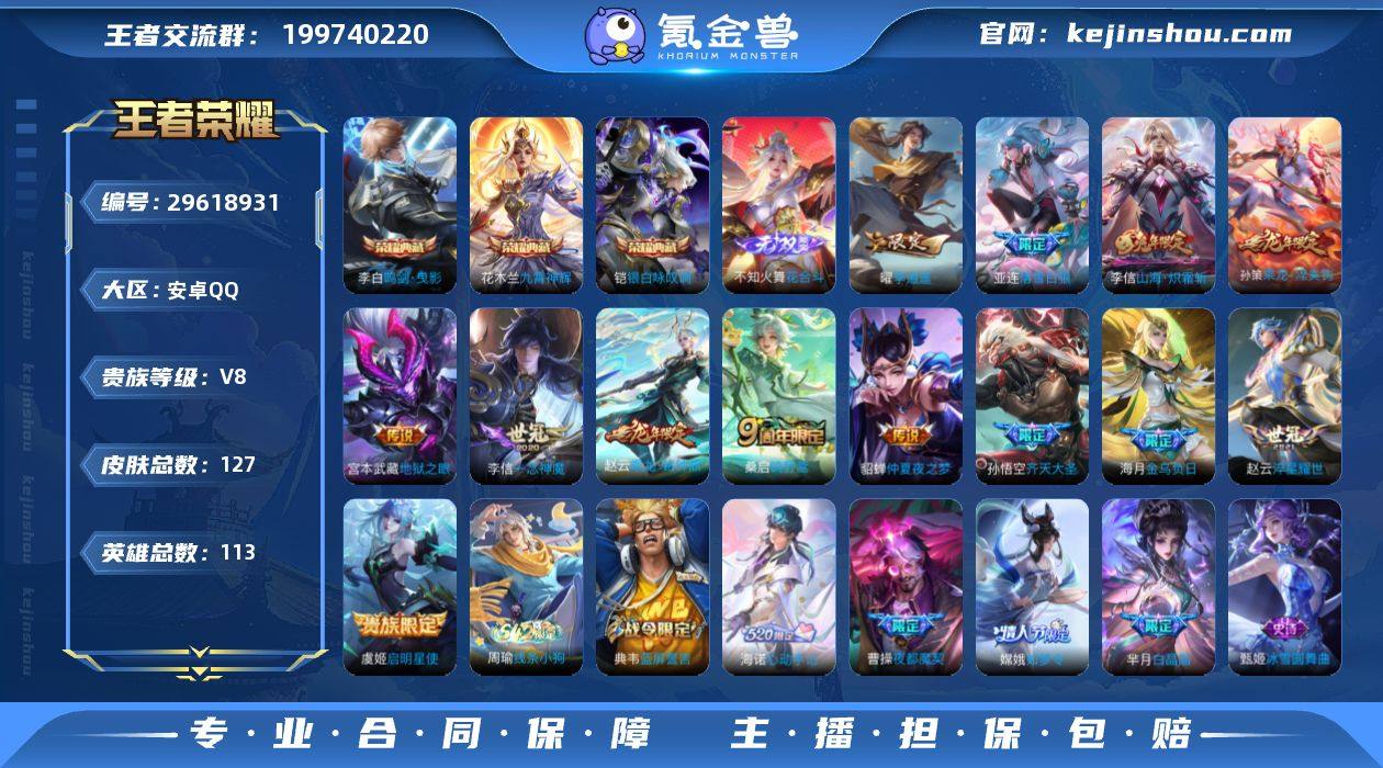 实名: 不可修改 性别: 男号 贵族等级: V8 英雄数: 113 皮肤数: 127 荣耀水晶: 鸣剑·曳影,九霄神辉,银白咏叹调 无双皮: 花合斗 传说皮: 一念神魔,仲夏夜之梦,地狱之眼,李逍遥,淬星耀世,山海·炽霜斩,乘龙·铭钟鼎,乘龙·淬吴钩,落雪白狼,金乌负日,启明星使 限定皮: 魔法小厨娘,白晶晶,如梦令-嫦娥,寅虎·心曲,齐天大圣,鸣野蒿,陌上桑