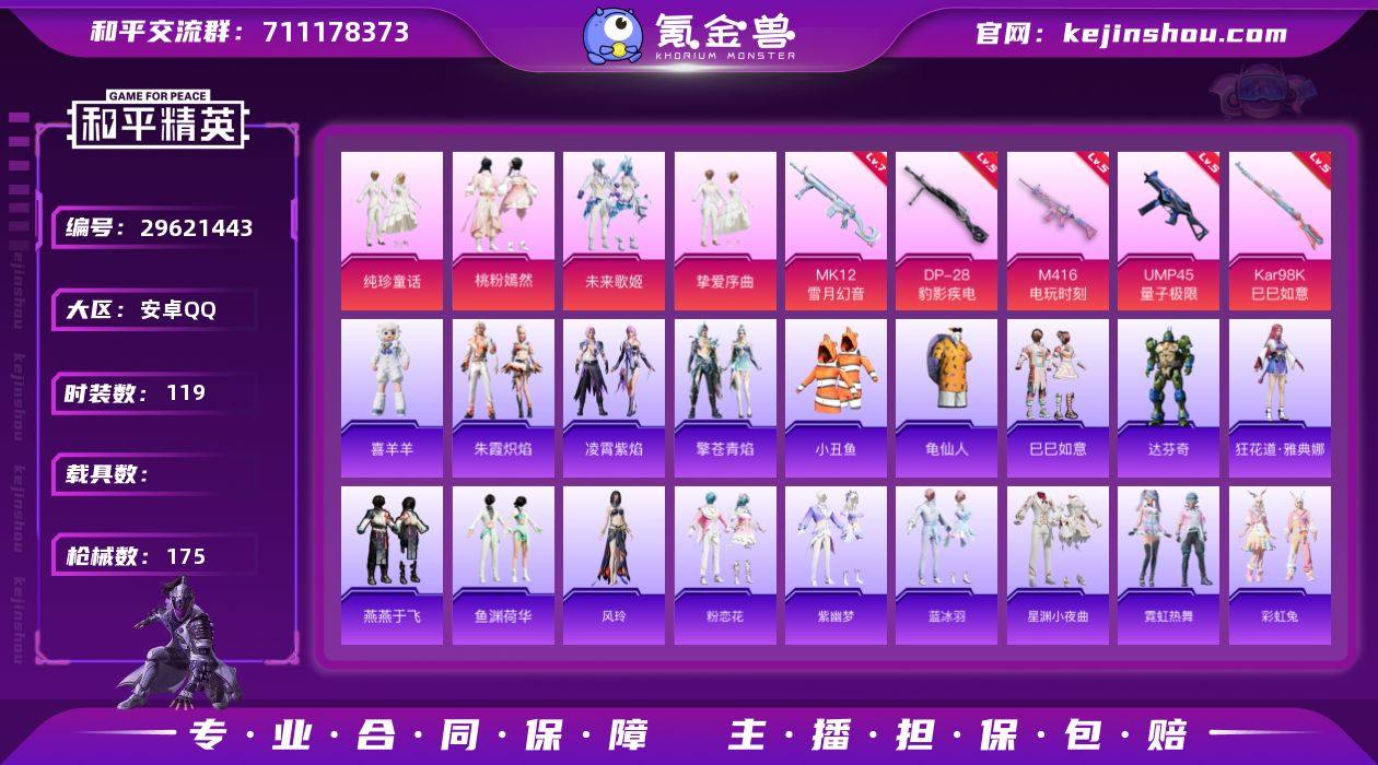 安卓 手Q-4粉装-6特效枪-0载具-0粉色飞行器-48512热力值-9王牌印记-119套装-175枪皮 【热门品类】:套装-小丑鱼,套装-龟仙人 【粉色套装】:粉装-挚爱序曲,粉装-纯珍童话,粉装-未来歌姬,粉装-桃粉嫣然 【粉色枪皮等级】:M416-电玩时刻(五级),UMP45-量子极限(五级),Kar98K-巳巳如意(五级),Mk14-甜梦熊击(五级),MK12-雪月幻音(七级),DP-28-豹影疾电(五级) 【粉色枪皮】:M416-电玩时刻,UMP45-量子极限,Kar98K-巳巳如意,Mk14-甜梦熊击,MK12-雪月幻音,DP-28-豹影疾电 【粉色降落伞】:第五大道降落伞,白勺歌姬降落伞,未来歌姬降落伞,精灵梦叶罗丽降落伞,月影灵韵降落伞,星穹咏叹调降落伞,双重狂想降落伞 【稀有套装】:套装-龟仙人,套装-巳巳如意,角色-达芬奇,角色-狂花道·雅典娜,套装-燕燕于飞,套装-鱼渊荷华,角色-风玲,套装-粉恋花,套装-紫幽梦,套装-蓝冰羽,套装-星渊小夜曲,套装-霓虹热舞,套装-彩虹兔,套装-云朵鹅,套装-雪绒豹,套装-朱霞炽焰,套装-凌霄紫焰,套装-擎苍青焰,玩偶服-喜羊羊 【稀有枪皮】:AKM-灼热熔岩,AKM-破晓战魂,AKM-龙的传人,M16A4-幻世战舞者,SCAR-L-夜灯,SCAR-L-玉兔迎春,SCAR-L-红色方程式,SCAR-L-冷漠罗丽,M416-糯团青竹,M416-红色方程式,M416-蓝色火焰,GROZA-影袭,GROZA-懵萌河马,AUG-天降萌叽,AUG-耀粉歌者,AUG-黑白懵懵牛,QBZ-洛神天依,M762-彩虹符号,M762-萌物绒绒,M762-云朵鹅,Mk47-炫光之旅,G36C-懵萌河马,G36C-星穹咏叹调,蜜獾-娇憨猪猪,ARX-凌霄紫焰,UZI-天降萌叽,UZI-娇憨猪猪,UZI-红色方程式,UMP45-夜灯,UMP45-涂山之恋,UMP45-蓝色火焰,Vector-焰鹰斗篷,Vector-夜灯,Vector-彩虹符号,汤姆逊-天降萌叽,汤姆逊-耀粉歌者,JS9-凌霄紫焰,P90-巳巳如意,Kar98K-红色方程式,M24-影袭,M24-奇异狩猎者,AWM...
