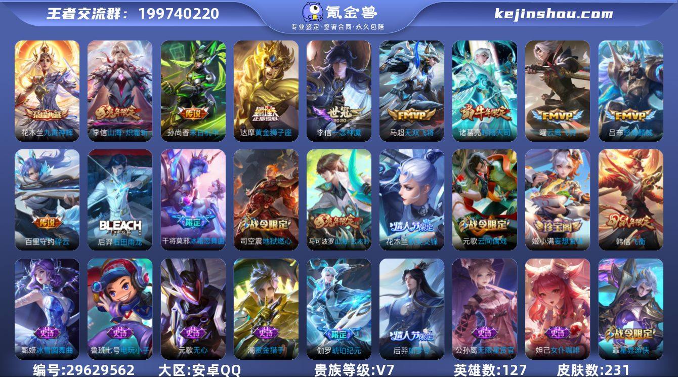 实名: 可修改 贵族等级: V7 英雄数: 127 皮肤数: 231 荣耀水晶: 九霄神辉 传说皮: 黄金狮子座,云鹰飞将,一念神魔,末日机甲-孙尚香,无双飞将,碎云,山海·炽霜斩 限定皮: 遇见飞天,梁祝,时雨天司,飞衡,冰霜恋舞曲,如梦令-后羿,默契交锋-花木兰,高山流水,怒海麟威,山海·玄木吟