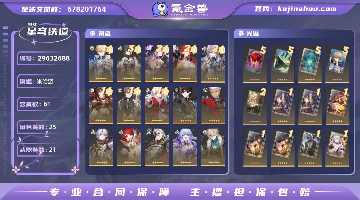 开拓等级:70 开拓者性别:女 总黄数:61 星轨专票:0 五星角色数:25 4命杰帕德,3命阮•梅,2命大黑塔,2命姬子,2命布洛妮娅,1命忘归人,1命瓦尔特,1命克拉拉,0命丹恒·腾荒,0命Archer,0命白厄,0命缇宝,0命波提欧,0命知更鸟,0命砂金,0命黄泉,0命花火,0命真理医生,0命镜流,0命符玄,0命丹恒·饮月,0命刃,0命罗刹,0命景元,0命白露 五星光锥数:21 5精不息的演算,5精记一位星神的陨落,5精星海巡航,3精制胜的瞬间,2精如泥酣眠,1精向着不可追问处,1精长路终有归途,1精唯有香如故,1精驶向第二次生命,1精夜色流光溢彩,1精行于流逝的岸,1精镜中故我,1精此身为剑,1精比阳光更明亮的,1精到不了的彼岸,1精拂晓之前,1精银河铁道之夜,1精但战斗还未结束,1精孤独的疗愈,1精记忆的质料,1精记忆永不落幕 邮箱状态:送网易邮箱