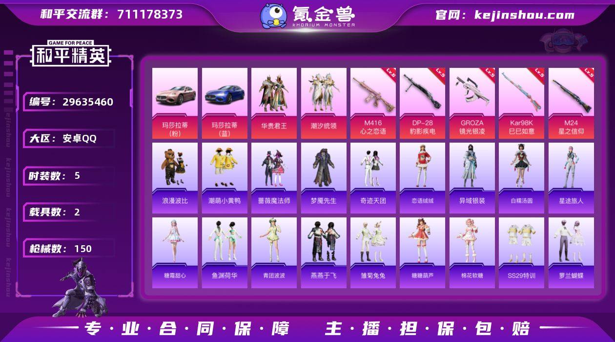 【特价出售】安卓Q-2载具2粉装5特效枪17热门127套装150枪皮 47360热力值 3印记 历史超级王牌4星 【2载具】 玛莎拉蒂蓝色 玛莎拉蒂粉色 【2粉装】 华贵君王 潮汐统领 【5特效枪】 M416-心之恋语 (6级) M24-星之信仰 (5级) Kar98K-巳巳如意 (5级) DP-28-豹影疾电 (5级) GROZA-镜光银凌 (5级) 【17热门】 奇迹天团 雪山精英 潮萌小黄鸭 梦魇先生 蔷薇魔法师 奇迹天团 浪漫波比 海洋之心 破蛋小黄鸡 新侠客行 软嫩糖心蛋 黑色刀锋 极速红龙 赛博空间 M416-仓鼠灰灰 M762-潮萌小黄鸭 AUG-魔法学院 【3头盔】 九霄头盔 精灵迷巫头盔 金风玉露头盔 【5背包】 九霄背包 精灵迷巫背包 梦幻火箭背包 水曜玄武背包 金风玉露背包