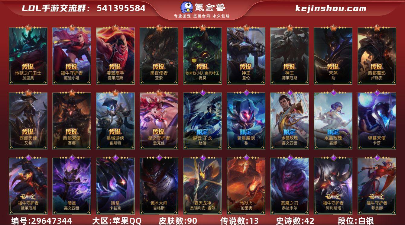 皮肤数:90 典藏皮肤数量:0 神话皮肤数量:0 传说皮肤数量:13 史诗皮肤数量:42 段位:白银 卖家说:连体火影和安卓王者荣耀