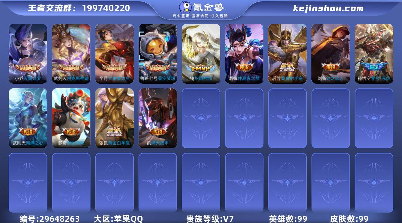[]V7 4典藏 12传说 99英雄 99皮肤 典藏英雄武则天 可修改实名 女号 【稀有英雄】:嬴政(始皇帝),韩信(韩跳跳),夏洛特(夏师傅),艾琳,橘右京(橘子),娜可露露(鸟人),不知火舞,赵云 【荣耀水晶】:天鹅之梦(小乔典藏),星空梦想(太空人),大秦宣太后,倪克斯神谕(宇宙婆娘) 【传说皮】:黄金射手座,黄金白羊座,零号·赤焰,仲夏夜之梦(大飞蛾),海洋之心,炽阳神光,胖达荣荣,时之恋人-刘备(电焊工),绛天战甲(鸡嘴战神) 【赛季/战令皮】:原初探秘者(s21),万华元夜(s22),演武夺筹(s23),驱傩正仪(s24),星空之诺,单词大作战,狂想玩偶喵,潮玩骑士王,云间偶戏,神迹守卫-墨子,航海奇遇记 【史诗皮】:遇见神鹿,紫霞仙子,特工魅影,千年之狐,偶像歌手,猫狗日记-大乔,时之恋人-孙尚香,天才门将,德古拉伯爵,幽灵船长,纤云弄巧,箭羽风息,圣诞恋歌,鹰眼统帅,暗夜贵公子,魅力维加斯 【限定皮】:白晶晶,时雨天司(水龙头),天狼运算者,御风骁将(吕布年限),奔雷神使(牛魔年限),祈雪灵祝(雪兔子),奇迹圣诞,默契交锋-兰陵王,默契交锋-花木兰,冰霜恋舞曲 【普通皮】:神迹守卫,尼罗河女神,花好人间,归虚梦演-曜,归虚梦演-西施,海滩派对,皇家上将,魔术师,化身博士,缤纷绘卷,乓乓大师,黄金武士,大发明家,天使之翼,鲤鱼之梦,阴阳师,死亡骑士,少女阿狸,丁香结,奇妙博物学,爱心护理,科学大爆炸,东方不败,玩偶对对碰,瓷语鉴心,次元傲视,孤猎,露花倒影,修竹墨客,灼热之刃,踏雪寻梅,未来旅行,龙域领主,地府判官,圣殿之光,维京掠夺者,异域舞娘,星航指挥官,激情绿茵,精灵王,加勒比小姐,熊喵少女,启蛰,魇语军师,霓裳曲,花间舞,占星师,海军大将,精灵公主,