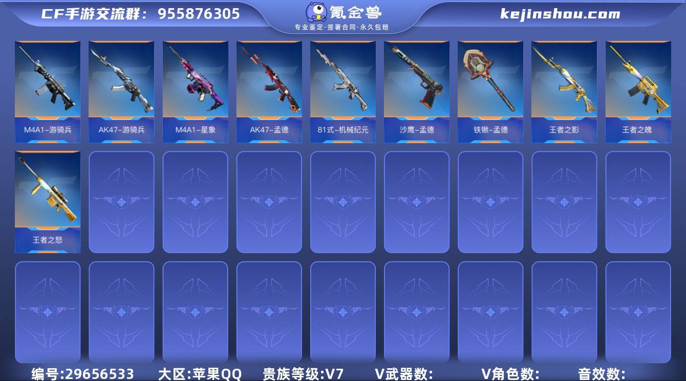 苹果Q☝贵族7☝M4A1-星象☝王者之魄☝AK47-孟德三件套☝81式-机械纪元☝M4A1-游骑兵-KZ☝AK47-游骑兵一紫魔☝王者之影☝王者之怒☝详细见图☝