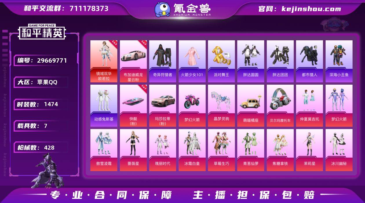 热力值:199064 载具数:7 时装数:1474 枪械数:428 战备数:353 游戏等级:66 王牌印记:18 卓越印记:0 传奇印记:0 绝世印记:0 一级镜域双华-欧若拉 一级布加迪威龙(星云粉) 傲雪凌霜,暗星紫秘,暗夜鎏金,宝贝奶油派,冰川粉黛,冰川红玫,冰川幽秘,缤纷油彩,薄荷物语,白兰星,冰霜白皇,白勺歌姬,彩虹鹿灵,彩虹甜喵,草莓生巧,炙焰红王,纯珍童话,电磁星,呆萌星弥,第五大道,蝶舞迷情,蝶舞蔷薇,独舞天鹅,放客神游,粉色回忆,花间之火,酣梦娃娃,黑伞漫漫,红伞翩翩,黄伞悠悠,海盐物语,金属狂野,焦糖拿铁,霁雪冰心,橘柚倾心,恐龙拽拽,灵感创作师,林间仙鹿,岚岚物语,蓝莓炮弹,洛天依,梦幻火箭,瑰丽时代,茉莉星,蜜桃特工,暖熊萌萌,青葱仙萝,千金淑猫,蔷薇星,深海曼妙,山涧鹿灵,时空协奏·心弦,天使彩虹糖,圣堂之誓,闪耀律动,天禅智恒,甜蜜誓约,甜梦小狐,童趣迷兔,甜心巧克力,馨动时刻,雪国幻梦,炫光之旅,绚金瑰梦,小叽联名款,小可学妹,星空之魅,绚丽摇曳,新星烈龙,星夜魔法师,旋转彩虹,严莉莉,紫电风暴,挚爱序曲,筑梦精灵,仲夏莫吉托 七级AKM-甜心宝贝,七级M762-甜蜜誓约,六级汤姆逊-冰川粉黛,五级DP-28-豹影疾电,五级DP-28-千金淑猫,五级GROZA-旋转彩虹,五级Kar98K-巳巳如意,五级M249-蓝莓炮弹,五级M417-第五大道,五级P90-仙履奇缘,五级SCAR-L-童趣迷兔,五级UZI-绮梦青鸾,五级Vector-飒粉甜心,四级AWM-橘柚倾心,四级M416-心之恋语,四级MG3-洛神天依,四级UMP45-恐龙拽拽,三级M24-镜域双华,三级M416-超新星,三级M416-墨龙九天,三级平底锅-林间仙鹿,三级UZI-筑梦精灵,二级Kar98K-伏魔团,二级SKS-碧影闪光,二级汤姆逊-怪笑疯兔,二级Vector-红伞翩翩,一级DP-28-暗夜鎏金,一级M249-彩虹甜喵 一级快艇-塞莎KL27(霓虹粉),布尔玛摩托车,晶梦灵驹,萌喵橘座,玛莎拉蒂Ghibli(粉),双人摩托-梦幻火箭 僚机-萌兔起飞,炫彩糖果降落伞,炫彩糖果飞行器,百合蜜语飞行器,春暖花开飞行器,红伞翩翩飞行器,镜域双华-灵镜之阶,梦幻火箭飞行器,千面幻镜飞行器,神秘黑猫飞行器,甜蜜誓约飞行器,甜心娃娃飞行器,天之羽翼飞行器,夏日绵绵冰飞行器,夜幕颂歌飞行器,庄周梦蝶飞行器,暗夜鎏金降落伞,暗翼战神降落伞,百合蜜语降落伞,冰川粉黛降落伞,白勺歌姬降落伞,变形金刚降落伞,碧影闪光降落伞,彩虹甜喵降落伞,春暖花开降落伞,超新星降落伞,第五大道降落伞,拂晓神骑降落伞,怪笑疯兔降落伞,幻彩电音降落伞,红伞翩翩降落伞,环太平洋降落伞,海渊国主降落伞,精灵梦叶罗丽降落伞,江南烟雨降落伞,焦糖拿铁降落伞,橘柚倾心降落伞,镜域双华降落伞,恐龙拽拽降落伞,林间仙鹿降落伞,蓝莓炮弹降落伞,洛神天依降落伞,绿意幻情降落伞,龙珠超降落伞,梦幻火箭降落伞,梦幻舞会降落伞,萌酷奶龙降落伞,妙趣可丽降落伞,暖熊萌萌降落伞,千金淑猫降落伞,绮梦青鸾降落伞,飒粉甜心降落伞,时空协奏降落伞,沙丘之主降落伞,圣堂之誓降落伞,甜蜜誓约降落伞,甜梦小狐降落伞,童趣迷兔降落伞,甜心宝贝降落伞,甜心娃娃降落伞,桃夭倾城降落伞,天之羽翼降落伞,未来歌姬降落伞,未来战士降落伞,炫光之旅降落伞,绚金瑰梦降落伞,星穹咏叹调降落伞,夏日绵绵冰降落伞,香水柠檬降落伞,旋转彩虹降落伞,筑梦精灵降落伞,仲夏莫吉托降落伞,炙焰牛王降落伞 火箭少女101,奇异狩猎者,炫彩糖果,粉黛兰香,萌鸡速