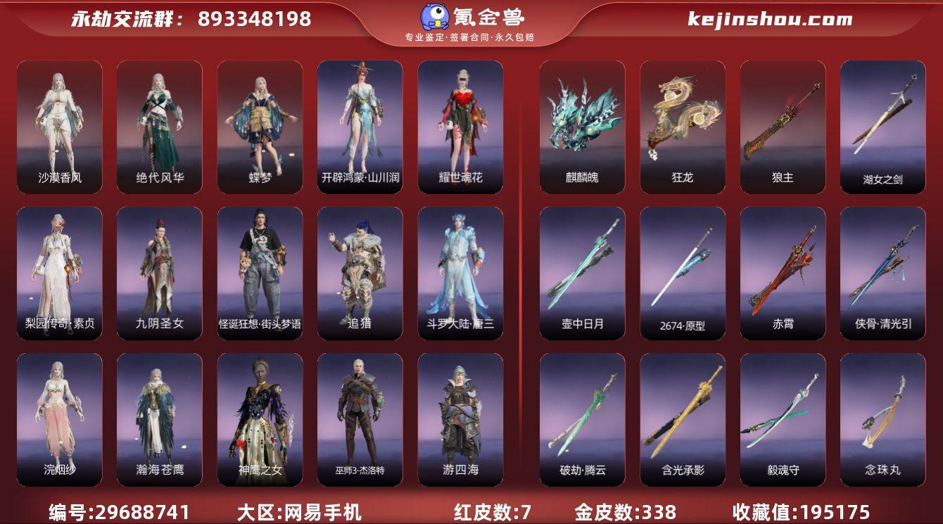 红皮数:7 黄皮数:338 收藏值:195175 幻丝数:41384 等级:199 三排段位:黄金 通行证:未升级 沙漠香风,绝代风华,蝶梦 麒麟魄,狂龙,狼主 墨离