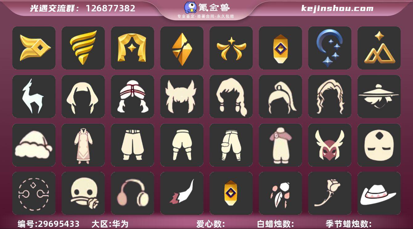 白枭王子围巾武士裤透明蝶翼圣诞鹿角新春福娃玫瑰花资源:蜡烛767 爱心83 红烛83 11翼 已毕业地图:全图毕业 毕业季节:风行季 潜海季 表演季 破晓季 欧若拉季 追忆季 夜行季 拾光季 九色鹿季 稀有礼包:橘子发饰 雪花发饰 圣诞鹿角 小王子斗篷 冥龙南瓜 热门裤子:背带裤 遥鲲长袍 绑带舞服 奔月长袍 女巫长裙 白棉裤 搓澡巾 紧身连体衣 武士裤 小王子服 羽袖长袍 女仆围裙 兔年套装 热门面具:矮人面具 狐狸面具 黄鼠狼面具 潜海面具 黄眉面具 一字眉 棕熊面具 盲僧眼罩 红脸蛋 玫瑰花面具 黑脸 热门发型:海藻头 爆炸头 大胡子 小飞象 雨妈 卡卡 平菇 龙骨 箬笠 蝴蝶结 公主头 粗辫 水母头 书虫 总裁头 正太头 高马尾 明制帽 郡主头 斗笠 军帽 虚荣 小王子头 白枭 圆环发辫 留辫蘑菇头 兔子头 春丽丸子头 樱花头 猫猫头 女巫发型 圣诞帽 光头 热门头饰:毕业羽毛 尖角牛仔帽 牛仔帽 橘子发饰 珊瑚发饰 雪花发饰 红耳机 辫子发饰 圣诞鹿角 热门斗篷 花瓣斗篷 红金店铺 黑金斗篷 白金斗篷 蝴蝶斗篷 汉服斗篷 连帽斗篷 小王子斗篷 燕尾服斗篷 暗花斗篷 冥龙斗篷 姚坤新的 展翼圆环斗 透明斗篷 小浣熊斗篷 毛绒斗 飘带斗篷 国风斗篷 新年福娃斗篷 樱花斗篷 地球日斗篷 海洋斗篷 漩涡斗篷 水纹斗篷 彩虹斗篷 暗彩斗篷 : 热门背饰:号角 小号 冥龙号角 相机进阶版相机 椅子 吊床 星星灯 鲲灯 女巫茶桌 圣诞节椅子 玫瑰花 风铃 冥龙南瓜 【毕业地图】:晨岛,云野,雨林,霞谷,暮土,禁阁 ,圣诞鹿角,新春福娃礼包,蝴蝶结,冥龙南瓜,水纹斗篷,海洋斗篷,漩涡斗篷,国风斗篷,汉服斗篷,花瓣斗篷,彩虹斗篷,黑金斗篷,蝴蝶斗篷,冥龙斗篷,暗花斗篷,白金斗篷,透明蝶翼