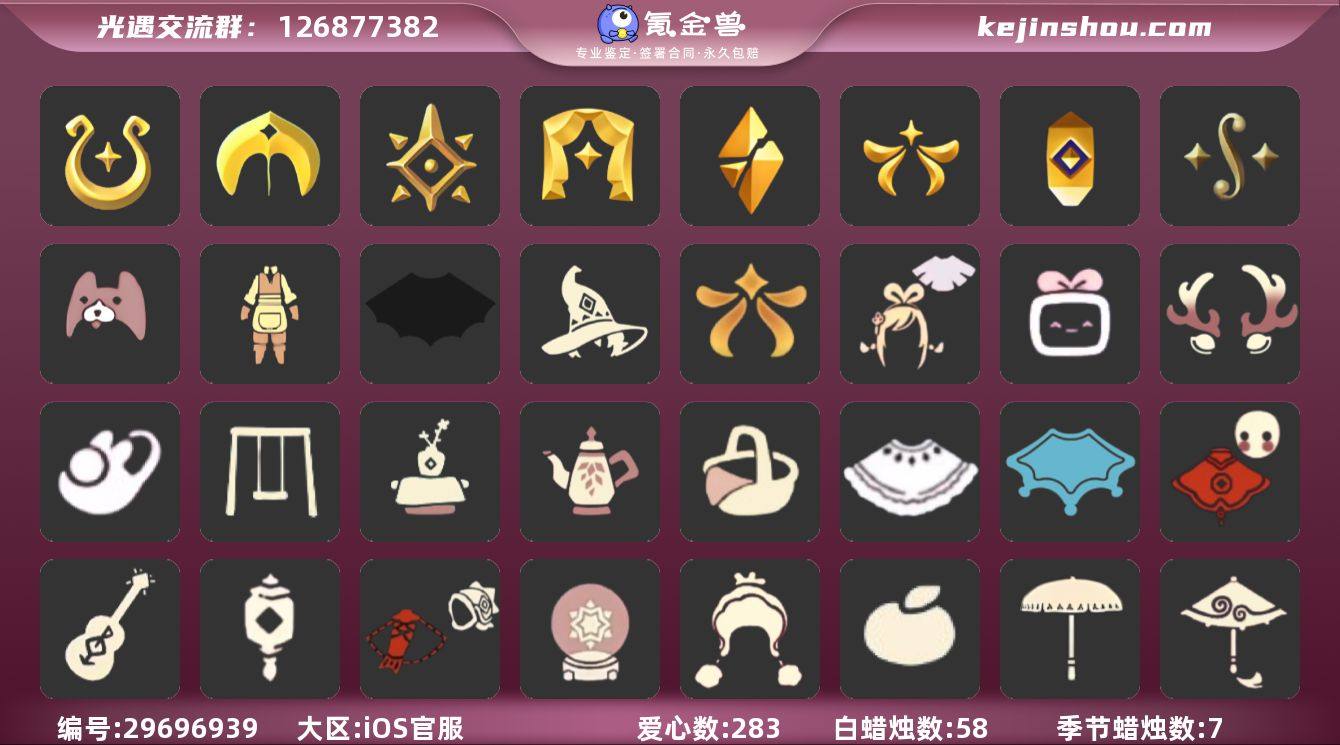 账号类型: 手机账号 季节已毕业: 魔法季,圣岛季,预言季,表演季,破晓季,欧若拉季,追忆季,二重奏季 完成地图: 全图毕业 珍稀物品: 阿努比斯(狗头),白枭,透明蝶翼斗,魔法季耳坠 礼包: 蝙蝠套,巫师,欧若拉之翼,绊爱,大铁头,鹿角,兔子鞋,秋千,茶桌,茶壶,餐桌,白绒金,瑞雪,福娃,吉他,灯笼,鲤鱼套,雪花球,绒帽,橘子,黄伞,红伞,兔子,南瓜,枯角,tgc,水母,猫套,猫背饰,星月头饰,彩虹耳钉,彩虹耳机,雪怪斗,新年裤,蝴蝶结,魔法棒,四叶草,雪人鞋,园丁装扮,小狗周年发饰 裤子: 武士裤 发型: 正太,花环,樱花,公主,书虫,虚荣,猫耳,老兵凌乱发型,冥龙长辫