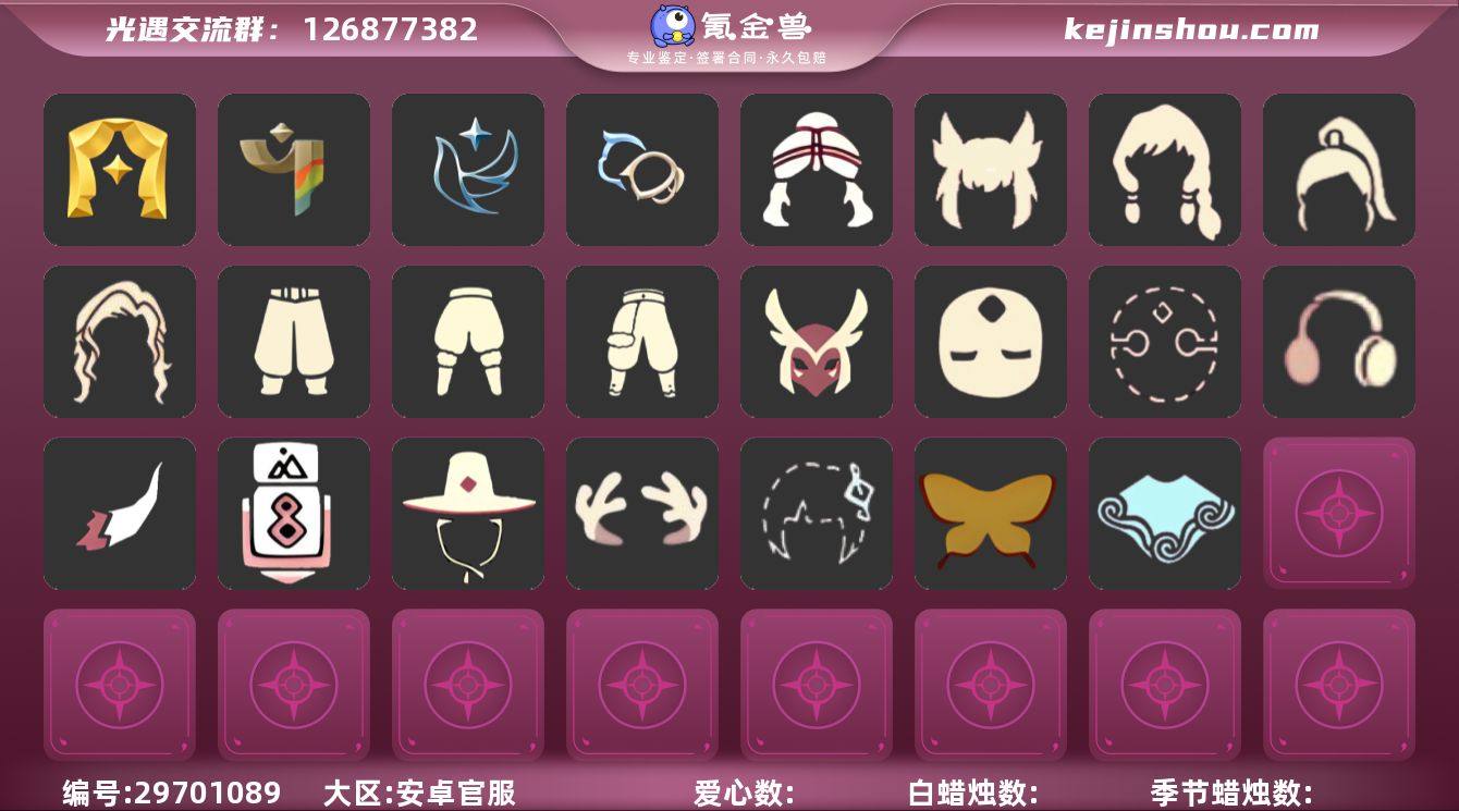 [17249169]安卓官服 手机账号 3珍稀物品 9毕业季 6毕业图 8蜡烛 【珍稀物品】白枭(帝企鹅发),透明蝶翼斗,彩虹围巾(五塑彩带斗) 【季节已毕业】表演季,破晓季,欧若拉季(欧若拉),追忆季,夜行季,拾光季,归巢季,九色鹿(九色鹿季),二重奏季 【完成地图】晨岛,云野,雨林,霞谷,墓土(暮土),禁阁 【礼包】青衫落拓礼包,蝴蝶结(大蝴蝶结),巫师(巫师帽),绊爱(绊爱斗篷)(绊爱礼包),雪花(雪花发夹),贝壳(贝壳发饰),兔子(玉兔头饰)(玉兔发饰)(兔子发饰),星月头饰(星月头冠),新年耳钉(金鳞耳饰),彩虹耳机,鹿角(圣诞鹿角),蜘蛛斗(蛛丝斗篷)(蛛网斗篷),白绒金(白雪斗篷),吉他(音韵吉他)(白吉他),红伞(瑞气纸伞),献瑞折扇礼包,茶桌(花憩茶桌) 【裤子】王子服(小王子套装),蓝绿裤(高领舞服),武士裤,背带裤,搓澡巾,击剑裤 【面具】黄眉企鹅面具,夜行毕业面具(棕熊面具) 【面饰】黑框眼镜(粗框眼镜),青鸟毕业面饰(青鸟面饰),红耳机 【项链】围巾(肩带) 【发型】小王子发型,单侧绑发(单边小辫),留辫蘑菇头,飞天盘发(九色鹿丸子头),虚荣,归巢毕业发型(五塑彩羽发),若笠(箬笠) 【头饰】平顶帽,蓝色音乐会(蓝色音乐符),牛仔帽(西部帽) 【斗篷】领主红斗篷(暗红斗篷),冥龙斗篷,燕尾斗篷,遥鲲斗篷(双翼遥鲲斗),粉红绒毛斗篷(绒毛斗篷),彩染围巾斗篷,绿芽,海洋斗 【配饰】鲲灯(追忆之书),相机(季卡相机),雨伞,高音钢琴(白色高脚钢琴)