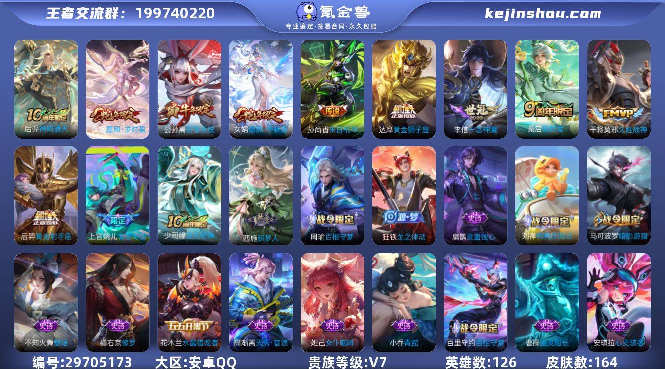 贵族等级:V7 典藏皮肤数:0 珍品无双皮肤数:0 无双皮肤数:0 珍品传说皮肤数:0 传说皮肤数:11 史诗皮肤数:41 皮肤数:164 英雄数:126 段位:绝世王者 卖家说:中路发育路号