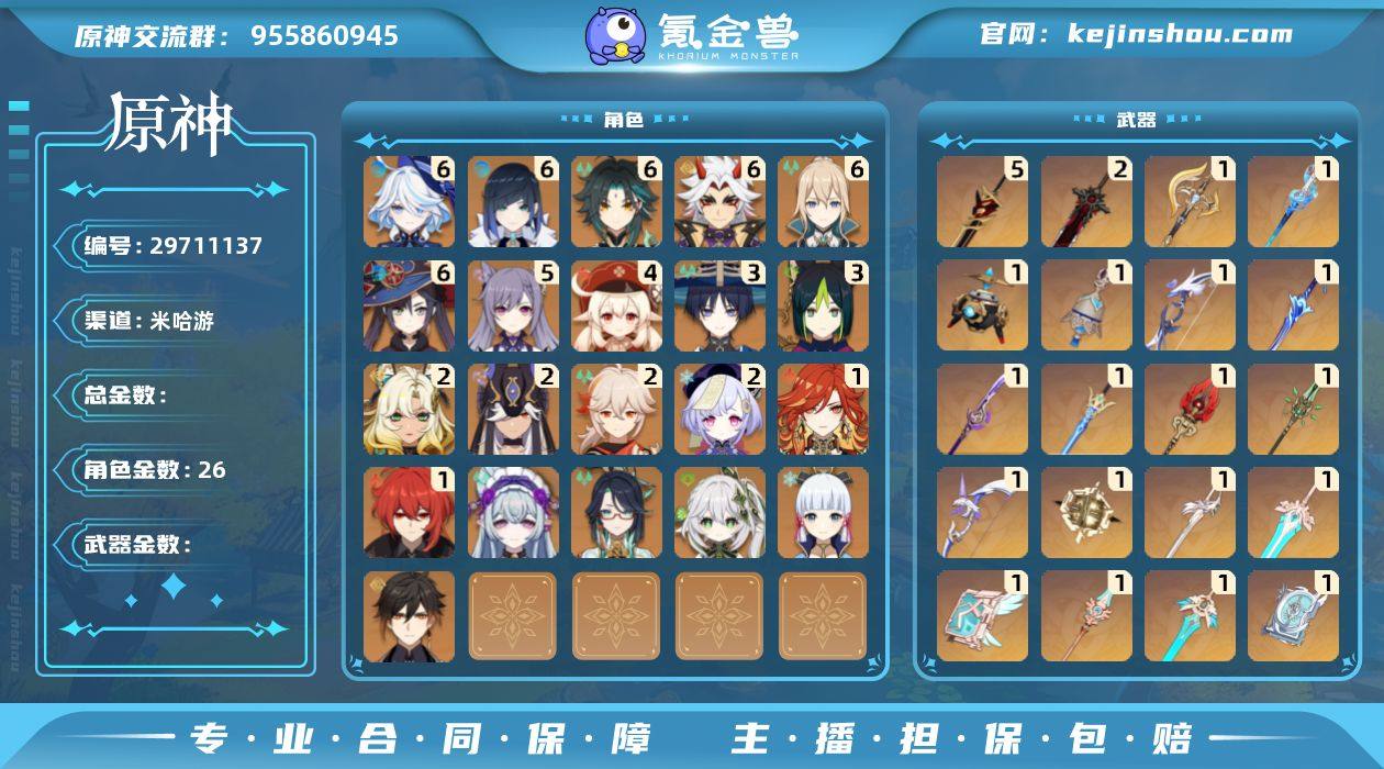 冒险等级:60 总黄数:49 5星角色数:26 5星武器数:8 原石数量:14067 纠缠之源数量:50 6命莫娜,2命芙宁娜,2命琴,1命兹白,1命那维莱特,1命雷电将军,1命达达利亚,1命七七,0命哥伦比娅,0命伊涅芙,0命丝柯克,0命梦见月瑞希,0命玛薇卡,0命茜特菈莉,0命希诺宁,0命玛拉妮,0命阿蕾奇诺,0命艾尔海森,0命纳西妲,0命夜兰,0命神里绫人,0命神里绫华,0命枫原万叶,0命钟离,0命提纳里,0命刻晴 6命班尼特,6命卡齐娜,6命赛索斯,6命行秋,6命北斗,6命迪奥娜,6命九条裟罗,6命坎蒂丝,6命罗莎莉亚,6命诺艾尔,6命砂糖,6命五郎,6命烟绯,6命瑶瑶,6命早柚,5命叶洛亚,5命菲谢尔,5命柯莱,5命莱依拉,4命爱诺,4命久岐忍,4命绮良良,4命多莉,4命丽莎,3命嘉明,3命安柏,3命珐露珊,3命雷泽,3命凝光,2命菲米尼,2命琳妮特,2命欧洛伦,2命香菱,2命夏洛蒂,2命夏沃蕾,2命芭芭拉,2命重云,2命辛焱,2命云堇,1命伊安珊,1命伊法,1命凯亚,1命卡维,1命鹿野院平藏,1命米卡,0命蓝砚,0命塔利雅,0命托马 精1帷间夜曲,精1和璞鸢,精1阿莫斯之弓,精1尘世之锁,精1狼的末路,精1天空之翼,精1四风原典 100%侦察骑士,古恩希尔德的传承,帆影游风,倩影游侠,岁夜欢哗,星与月之约,雨化竹身,叶隐芳名,致教会自由人 卖家说:号上有50个粉球和1万4原石,有月结晶,纳塔,龙王等主流配队,圣遗物还不错