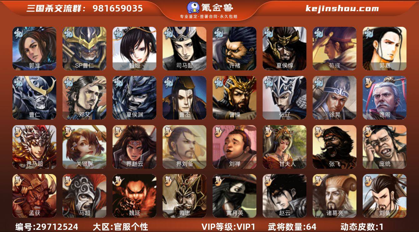 VIP等级:VIP1 官阶:士兵 史诗武将数量:3 动态皮肤数量:1 宝珠数量:0 将魂数量:4612 卖家说:士兵友诸葛64武将带谯周界朱然一体炸鱼号官服sgs字母账号可以换绑带4000魂2万豆子4万多羽毛安全可靠