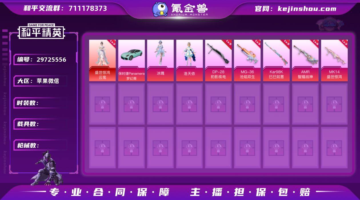 【特价出售】【永久包售后!!!】苹果 手Q-1神装-10粉装-8特效枪-1载具-7粉色飞行器-43163热力值-4王牌印记-71套装-130枪皮 【红色神装等级】:盛世惊鸿-云鸾(三级) 【红色角色神装】:盛世惊鸿-云鸾 【热门品类】:粉装-梦幻火箭,套装-派对舞王,套装-糯粉咩咩 【粉色套装】:粉装-梦幻火箭,粉装-蜜语绒猫,角色-千金淑猫,角色-月影灵韵,角色-萨利娅,角色-女娲灵识,角色-晶梦幻蝶,角色-彩虹独角兽,角色-月下星之子,角色-异瞳寒姬 【粉色枪皮等级】:M416-女娲灵识(三级),GROZA-镜光银凌(五级),AUG-许七安(五级),Kar98K-巳巳如意(五级),Mk14-盛世惊鸿(三级),Mk14-樱桃泡泡(三级),SVD-月影灵韵(四级),DP-28-豹影疾电(五级) 【粉色载具】:护世瑞兽 【粉色枪皮】:M416-女娲灵识,GROZA-镜光银凌,AUG-许七安,Kar98K-巳巳如意,Mk14-盛世惊鸿,Mk14-樱桃泡泡,SVD-月影灵韵,DP-28-豹影疾电 【粉色飞行器】:酣梦熊熊飞行器,镜域双华-灵镜之阶,龙翔九天飞行器,凤舞九天飞行器,万象金身飞行器 【粉色降落伞】:绝对恒星降落伞,梦幻火箭降落伞,沙丘之主降落伞,蜜语绒猫降落伞,墨龙九天降落伞,临安公主降落伞,脆鲨七海降落伞,月影灵韵降落伞,盛世惊鸿降落伞,鬼刀降落伞,彩虹独角兽降落伞,月下星之子降落伞,雪月幻音降落伞,喜羊羊与灰太狼降落伞,炫彩糖果降落伞 【稀有套装】:套装-熊抱抱,套装-航行童话,套装-绒宝小鹅,套装-巳巳如意,套装-炫彩糖果,角色-都市丽猫,角色-许七安,角色-临安公主,角色-怀庆长公主,角色-俏兔智灵,角色-光矢逐梦,套装-燕燕于飞,套装-鱼渊荷华,角色-风玲,角色-海琴烟,玩偶服-小狗蛇点点,套装-晶灵使者,套装-晶辉守护,套装-紫幽梦,套装-蓝冰羽,角色-夜瞳黯灵,套装-折梦之诗,套装-朱霞炽焰,套装-凌霄紫焰,玩偶服-美羊羊,角色-敖闰...