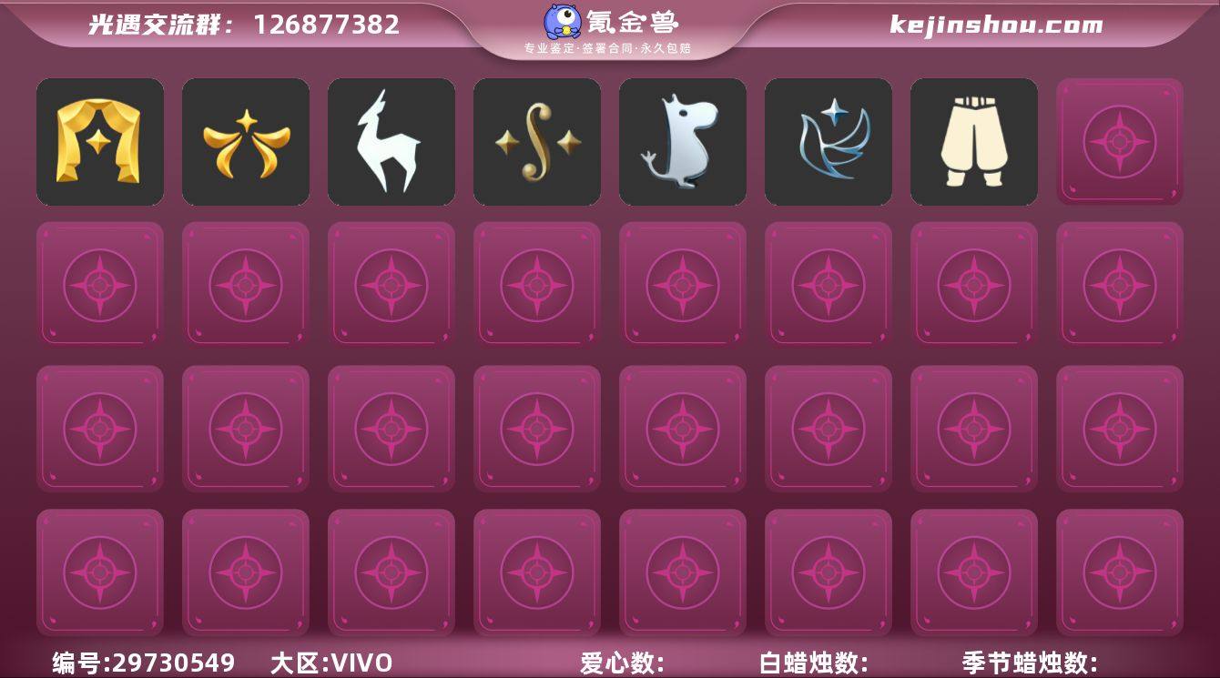 账号类型: 邮箱账号 季节已毕业: 梦想季,小王子季,表演季,集结季,夜行季,追忆季,归巢季,九色鹿季,彩染季 完成地图: 晨岛,云野,雨林,霞谷,暮土,禁阁 珍稀物品: 白枭,玫瑰花,彩虹围巾 礼包: 蝙蝠套,围巾,小狐狸,九色鹿角,鹿角,茶桌,瑞雪,吉他,橘子,贝壳,兔子,彩虹耳钉,四叶草,暗彩装扮,姆明饰品套装,献瑞折扇礼包,心心相印发饰礼包,小狗周年发饰,青衫落拓礼包,活力海牛礼包 裤子: 武士裤,背带裤,搓澡巾,击剑裤,王子服,飞天裤 面具: 凤凰面具,贴花面具,夜行毕业面具,黄眉企鹅面具,辉光羚羊面具 面饰: 红耳机 项链: 围巾 发型: 归巢毕业发型,若笠,虚荣,单侧绑发,小王子发型,留辫蘑菇头,飞天盘发 头饰: 行军锅头盔,蓝色音乐会,平顶帽 斗篷: 海洋斗,蟑螂斗,绿芽,粉红绒毛斗篷,遥鲲斗篷,黄色连帽披风,燕尾斗篷,彩染围巾斗篷 配饰: 雨伞,高音钢琴,玫瑰花,二重奏挂画,鲲灯 亮点: 【优质装备】:表演季,白枭(帝企鹅发),武士裤,梦想季,小王子季(王子季),归巢毕业发型(五塑彩羽发),行军锅头盔(六边锅帽子)(双耳锅帽子),高音钢琴(白色高脚钢琴),集结季,玫瑰花,夜行季,追忆季,彩虹围巾(五塑彩带斗),归巢季,九色鹿(九色鹿季),王子服(小王子套装),飞天裤(柔缎花边连)(九色鹿丝带裤),蟑螂斗(凤凰斗篷),围巾(肩带),二重奏挂画(合奏挂画),凤凰面具,贴花面具(丛林黑面具),夜行毕业面具(棕熊面具),黄眉企鹅面具,单侧绑发(单边小辫),小王子发型,留辫蘑菇头,粉红绒毛斗篷(绒毛斗篷),遥鲲斗篷(双翼遥鲲斗),黄色连帽披风(连帽斗篷)(斜边队长斗篷),燕尾斗篷,鲲灯(追忆之书),辉光羚羊面具,彩染季,飞天盘发(九色鹿丸子头),蝙蝠套(蝙蝠斗篷)(南瓜头),茶桌(花憩茶桌),红耳机,围巾(小王子斗篷)(小王子围巾),九色鹿角(神鹿祝福头饰)(神鹿祝福礼包),鹿角(圣诞鹿角),瑞雪(瑞雪斗篷)(暖冬瑞雪),吉他(音韵吉他)(白吉他),暗彩装扮(彩虹武士裤),姆明饰品套...