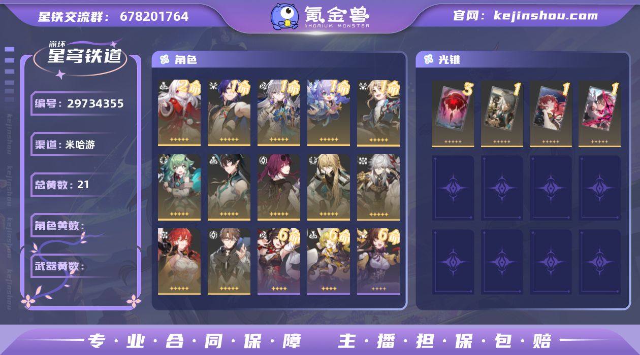 总黄数: 21 2命金色角色: 2命克拉拉 1命金色角色: 1命彦卿,1命白露,1命布洛妮娅,1命真理医生 0命金色角色: 0命景元,0命姬子,0命瓦尔特,0命罗刹,0命卡芙卡,0命丹恒•饮月,0命藿藿 精3武器: 精3记一位星神的陨落 精1武器: 精1拂晓之前,精1以世界之名,精1银河铁道之夜