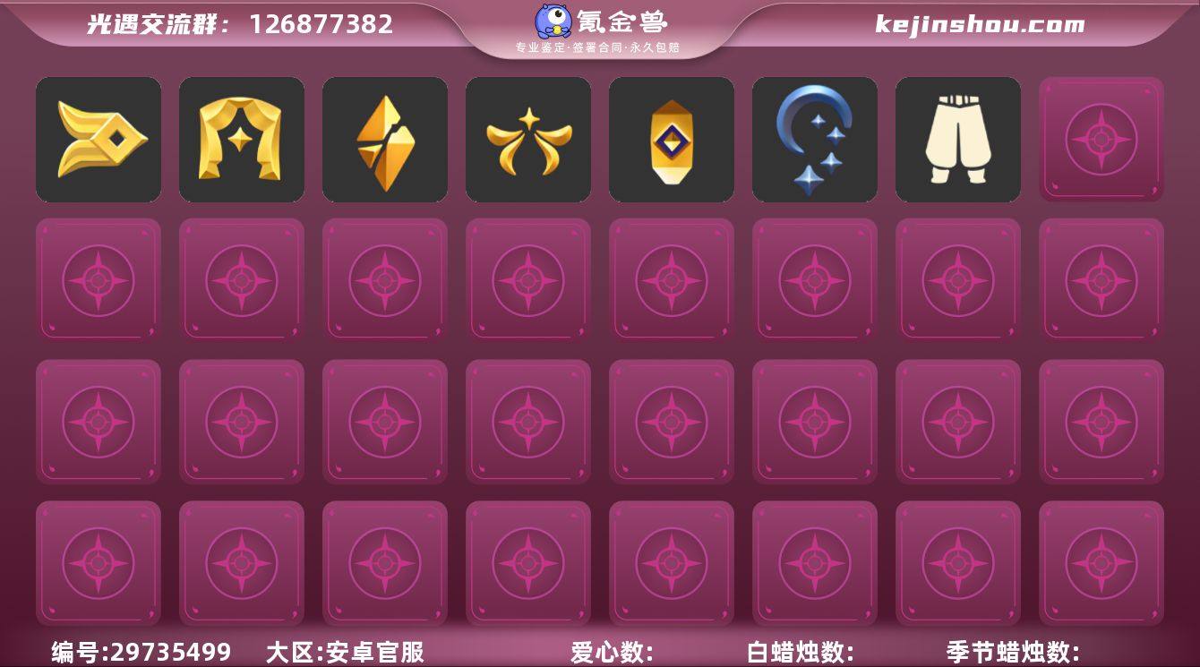 账号类型: 邮箱账号 季节已毕业: 表演季,破晓季,欧若拉季,夜行季,追忆季,拾光季,归巢季,九色鹿季,筑巢季,二重奏季,姆明季,彩染季,青鸟季,双星季,迁徙季 完成地图: 晨岛,云野,雨林,霞谷,暮土,禁阁 珍稀物品: 白枭,透明蝶翼斗,彩虹围巾 礼包: 巫师,围巾,兔子,新年裤,暗彩装扮 裤子: 武士裤,搓澡巾,妮妮裙子,蓝绿裤,飞天裤,筑巢季·裤子,青鸟尊贵蓬头裤子 面具: 夜行毕业面具,黄眉企鹅面具,辉光羚羊面具 面饰: 黑框眼镜,青鸟毕业面饰 项链: 围巾 发型: 归巢毕业发型,若笠,虚荣,留辫蘑菇头,飞天盘发 头饰: 牛仔帽,蓝色音乐会,平顶帽 斗篷: 海洋斗,绿芽,粉红绒毛斗篷,遥鲲斗篷,燕尾斗篷,冥龙斗篷,彩染围巾斗篷,青鸟毕业斗篷 配饰: 雨伞,筑巢季·小手办,高音钢琴,姆明抱枕,小红伞,相机,二重奏挂画,鲲灯 亮点: 【优质装备】:表演季,白枭(帝企鹅发),武士裤,青鸟尊贵蓬头裤子(蓝色燕尾服),破晓季,透明蝶翼斗,欧若拉季(欧若拉),归巢毕业发型(五塑彩羽发),筑巢季·小手办(光之子试衣),高音钢琴(白色高脚钢琴),夜行季,追忆季,妮妮裙子(妮妮长裙),牛仔帽(西部帽),姆明抱枕,小红伞(姆明红伞)(姆明大伞),相机(季卡相机),拾光季,彩虹围巾(五塑彩带斗),归巢季,九色鹿(九色鹿季),蓝绿裤(高领舞服),飞天裤(柔缎花边连)(九色鹿丝带裤),围巾(肩带),筑巢季,二重奏季,二重奏挂画(合奏挂画),姆明季,筑巢季·裤子(设计师长袍),夜行毕业面具(棕熊面具),黄眉企鹅面具,黑框眼镜(粗框眼镜),留辫蘑菇头,粉红绒毛斗篷(绒毛斗篷),遥鲲斗篷(双翼遥鲲斗),燕尾斗篷,冥龙斗篷,鲲灯(追忆之书),辉光羚羊面具,彩染季,飞天盘发(九色鹿丸子头),青鸟季,青鸟毕业面饰(青鸟面饰),青鸟毕业斗篷(青鸟斗篷),双星季,围巾(小王子斗篷)(小王子围巾),暗彩装扮(彩虹武士裤),巫师(巫师帽),新年裤(瑞气服饰),晨岛,云野,雨林,霞谷,墓土(暮土),禁阁,若笠(箬笠),兔子(玉兔头饰)(...
