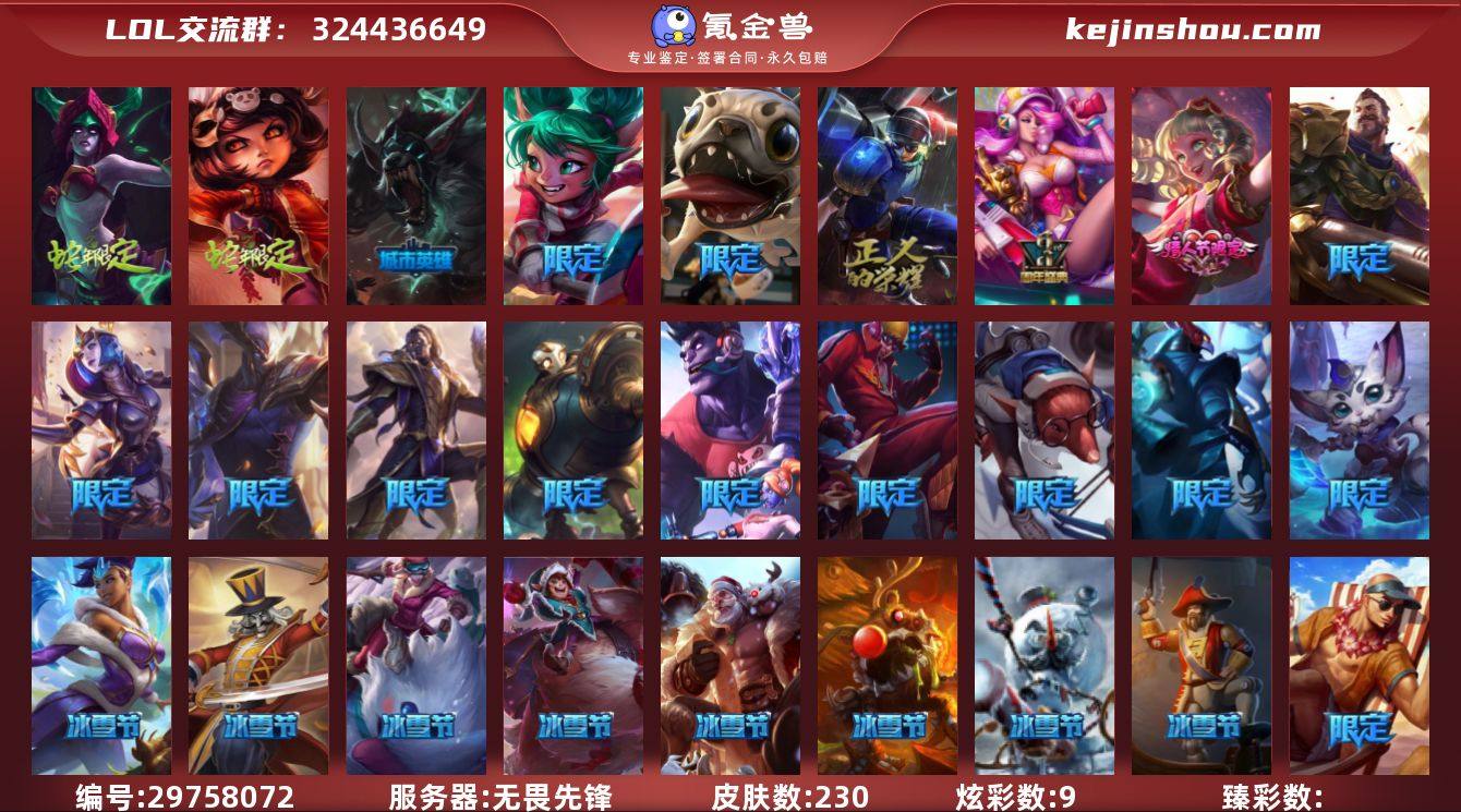 无畏先锋英雄163/皮肤230/炫彩9甜心宝贝 安妮/胜利枪神 格雷福斯/胜利女神 奥利安娜/胜利之剑 剑魔/胜利枪神 卢锡安/胜利机器人 布里茨/S2 暗杀星 蒙多/S3 SKT T1 李青/S4 SSW 图奇/S5 SKT T1 阿兹尔/S7 SSG 纳尔/冬季仙境 卡尔玛/胡桃夹子 小丑/魄罗骑士 瑟庄妮/圣诞狂欢 努努/圣诞老人 布隆/圣诞驯鹿 克格莫/雪默丁格/英勇玩具兵船长/泳池派对 李青/南瓜头 费德提克/蛇年 卡西奥佩娅/蛇年 安妮/3周年 厄运小姐/防爆天使 凯尔/暗影 沃里克/巧克力工坊 波比/克格汪 克格莫