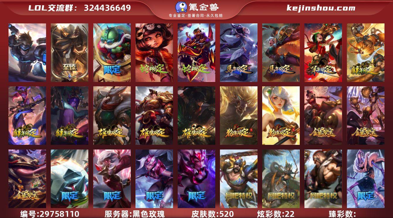 黑色玫瑰英雄159/皮肤520/神话2/炫彩22未来战士/至臻 王国机神玄武 盖伦/觅心猎手 薇恩/觅心魔灵 奥利安娜/觅心女王 艾希/甜心之翎 洛/甜心宝贝 娑娜/甜心之羽 霞/斗牛士 阿利斯塔/S1FNC 酒桶/S1FNC 迦娜/S1FNC 卡尔萨斯/S2 暗杀星 蒙多/S2 暗杀星 努努/S2 暗杀星 慎/S2 暗杀星 伊泽瑞尔/S3 SKT T1 劫/S3 SKT T1 薇恩/S3 SKT T1 李青/S3 SKT T1 婕拉/S4 SSW 图奇/S4 SSW 炼金/S6 SKT T1 球女/阿木木:“主人不要我了”/冰雪节 马尔扎哈/冰雪节 辛吉德/冰雪兽 纳尔/胡桃夹子 萨科/平安夜女神 娑娜/圣诞捣蛋鬼 金克丝/圣诞开心鬼 提莫/圣诞精灵 崔丝塔娜/圣诞狂欢 努努和威朗普/圣诞老人 古拉加斯/圣诞糖果棒 厄运小姐/圣诞玩偶 波比/圣诞驯鹿 克格莫/喜庆之树 茂凯/邪恶圣诞老人 维迦/幸福女神 乐芙兰/雪球也能爆炸!吉格斯/雪默丁格/雪装 奈德丽/英勇玩具兵 普朗克/泳池派对 吉格斯/泳池派对 蕾欧娜/泳池派对 格雷福斯/泳池派对 菲奥娜/泳池派对 李青/泳池派对 普朗克/泳池派对 扎克/泳池派对 蒙多/鬼影森森 茂凯/鬼影重重 魔腾/海贼 瑞兹/魅惑女巫 莫甘娜/魅惑女巫 奈德丽/南瓜头 费德提克/无头骑士 赫卡里姆/女皇 艾希/红色男爵 库奇/冰川巨兽 墨菲特/战地机甲 厄加特/宇航员 诺提勒斯/邪鸦魅影 乐芙兰/双重冰晶 艾尼维亚/地狱之门卫士 加里奥/绅士 科加斯/偶像歌手 阿狸/律政大亨 蒙多/烈焰雄心 崔丝塔娜/炼狱魔犬 内瑟斯/合金巨兽 努努和威朗普/鬼魂新娘 莫甘娜/钢铁军团 盖伦/恶魔之刃 泰达米尔/电玩女神 娑娜/第三类接触 黑默丁格/地狱行者 孙悟空/大天使长米迦勒 凯尔/苍穹之光 韦鲁斯/冰霜亚龙 希瓦娜/霸天异形 卡兹克/黯黑魔龙 希瓦娜/奥德赛 凯隐/最终BOSS 维迦/战场女武神 凯尔/源计划:联合 艾希/焰尾妖狐 阿狸/血石领主 弗拉基米尔/星之守护者 拉克丝/星之守护者 金克丝/铁哥们儿 奥拉夫/提莫:"约德尔人...