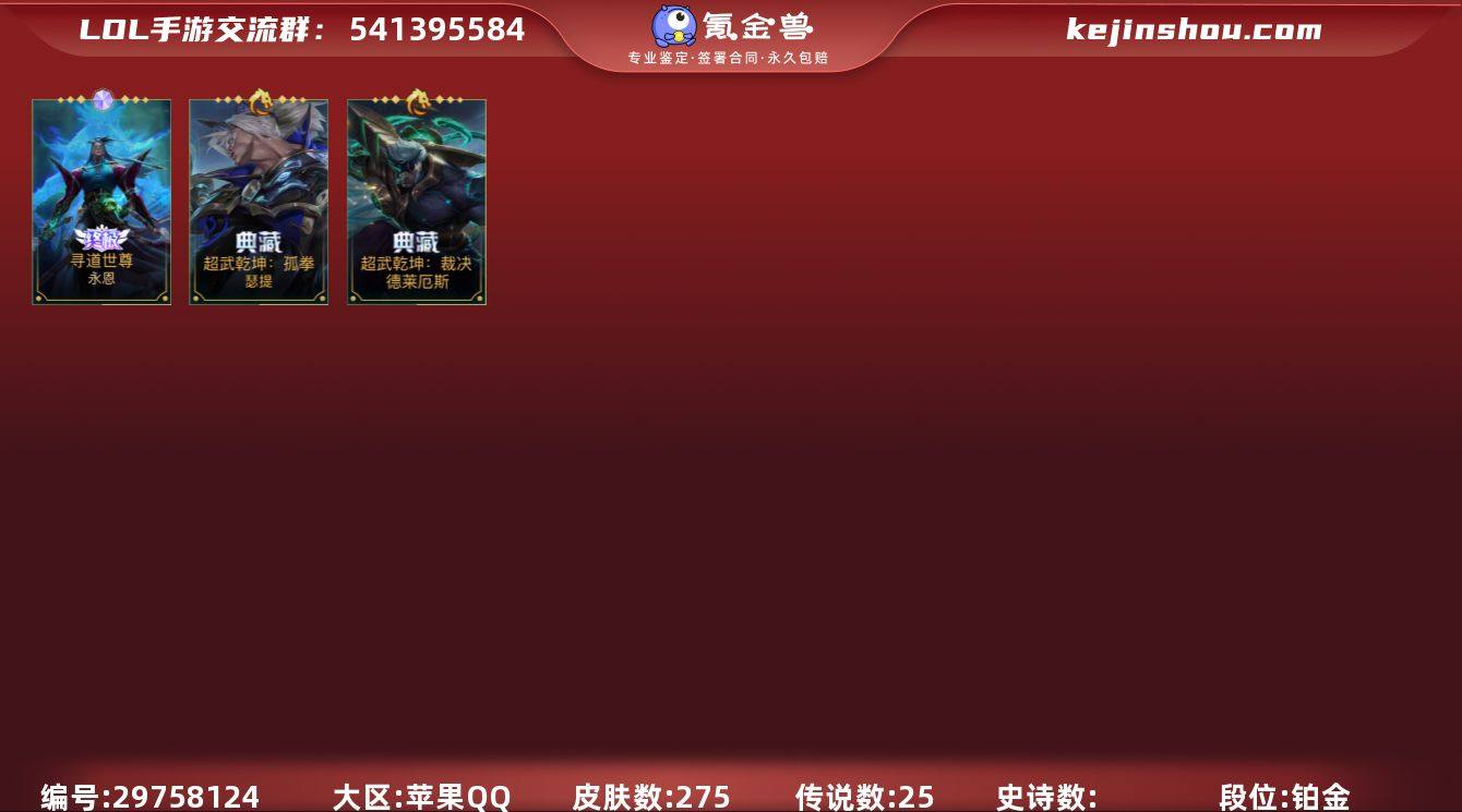 可二次终极永恩典藏诺手万豪至臻男枪剑魔永恩剑姬15水晶玫瑰玄都回城水晶花路水晶播报精品上单中单号 段位: 璀璨钻石Ⅰ, 英雄总数: 124, 皮肤总数: 276, 终极皮肤: 寻道世尊永恩; 典藏皮肤: 超武乾坤裁决德莱厄斯,超武乾坤孤拳瑟提; 臻藏皮肤: 臻藏光影巨翼亚托克斯; 神话皮肤: KBG任凭浪起破浪菲奥娜,龙的传人李青,战斗学院白金学长伊泽瑞尔,至臻心之钢永恩,光焰澎湃火力全开格雷福斯,至臻水晶玫瑰格温,灰烬骑士派克; 传说皮肤: 神王德莱厄斯,灌篮高手德莱厄斯,水晶玫瑰阿卡丽,神拳李青,斗魂无双亚索,西部天使赛娜,地狱之门卫士加里奥,福牛守护者厄运小姐,水晶玫瑰伊泽瑞尔,光明哨兵薇恩,驯龙炮手崔丝塔娜,星之守护者陨洛,黎明使者锐雯,水晶玫瑰拉克丝,灵魂莲华锤石,星之守护者阿狸,源计划泯灭雷克顿,神龙尊者驭风啸龙易,魔女伊芙琳,女主播迦娜,心之钢凯隐,日蚀骑士蕾欧娜,星之守护者落霞,暗星尊烬,水晶玫瑰萨勒芬妮; 史诗皮肤: 泳池派对菲奥娜,福牛守护者菲奥娜,玉剑传说无双菲奥娜,源计划火菲奥娜,水晶玫瑰艾希,神龙尊者苍龙艾希,御星魔矢艾希,福牛守护者德莱厄斯,西部魔影德莱厄斯,铁血女忍阿卡丽,KDAALLOUT阿卡丽,暗星嘉文四世,福牛守护者嘉文四世,水晶玫瑰嘉文四世,吕布奉先嘉文四世,腥红之月黛安娜,光明哨兵黛安娜,烈焰仙子黛安娜,无限烈焰黛安娜,天启骑士杰斯,水晶玫瑰杰斯,神奇先驱杰斯,圣诞老人布隆,末路管家布隆,破败军团希瓦娜,秘旅探索者希瓦娜,银河魔装机神希瓦娜,地下拳王李青,战场之王亚索,水晶玫瑰娑娜,电玩女神娑娜,涂鸦小队金克丝