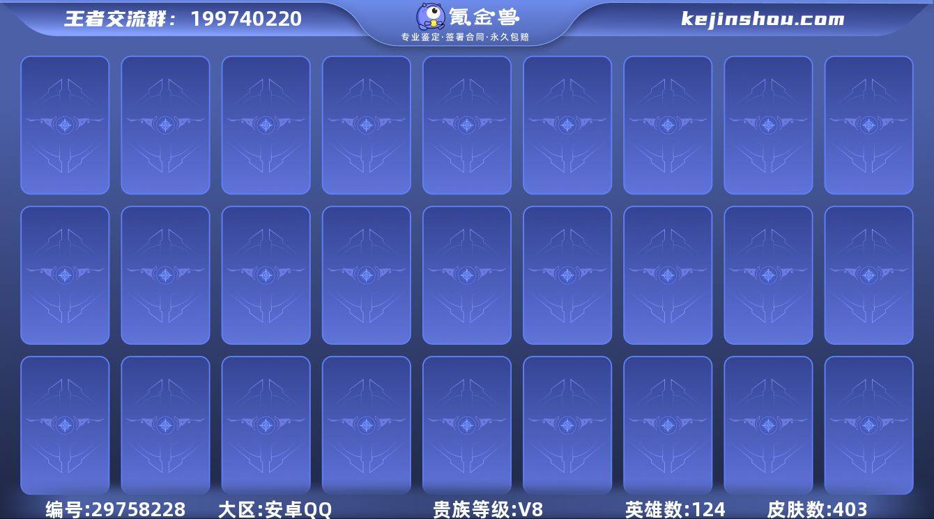 【英雄数量】124 【皮肤数量】404 【区服】安卓QQ516区 可二次 无防沉迷 【段位】至尊星耀I 【贵族等级】8 【稀有英雄】10 _橘右京 _嬴政 _不知火舞 _赵云 _娜可露露 _夏洛特 _艾琳 _金蝉 _敖隐 _韩信 【皮肤价值】320320 【内测皮肤】2 姬小满_妄想食味 艾琳_女武神 【荣耀皮肤】3 诸葛亮_星域神启 李白_鸣剑曳影 孙尚香_杀手不太冷 【珍品无双】0 【无双皮肤】0 【珍品传说】2 瑶_大耳狗之梦 张飞_兔狲蓬尾 【星元皮肤】3 未来机甲 幽冥火 星际治安官 【传说皮肤】16 妲己_愿照众生和 桑启_鸣野蒿 裴擒虎_寅虎赤拳 百里玄策_白虎志 虞姬_启明星使 孙策_末日机甲 孙尚香_末日机甲 宫本武藏_地狱之眼 孙悟空_地狱火 狄仁杰_超时空战士 女娲_补天 孙悟空_零号赤焰 干将莫邪_久胜战神 花木兰_冠军飞将 赵云_淬星耀世 后羿_黄金射手座 【史诗皮肤】117 扁鹊_灵蛊蚀心 狂铁_龙之律动 刘禅_鸭鸭历险记 阿轲_化蝶舞 牛魔_星界战将 孙膑_茶境仙 百里守约_百相守梦 亚连_破空之剑 蒙犽_顽岩魄 蔡文姬_夏日便利店 镜_青焰无极 狄仁杰_魔术师 赵云_皇家上将 廉颇_寅虎御盾 百里守约_朱雀志 云中君_时之祈愿 孙悟空_大圣娶亲 孙悟空_至尊宝 貂蝉_唤灵魅影 伽罗_箭羽风息 铠_曙光守护者 花木兰_水晶猎龙者 伽罗_琥珀纪元 韩信_傲雪梅枪 安琪拉_魔法小厨娘 阿古朵_江河有灵 鬼谷子_五谷丰年 庄周_高山流水 裴擒虎_李小龙 上官婉儿_梁祝 杨玉环_遇见飞天 甄姬_游园惊梦 关羽_冰锋战神 鲁班七号_蔬乡物语 高渐离_燃音魔法 司空震_地狱燃心 暃_星界游侠 钟无艳_超时空战士 狂铁_电玩高手 明世隐_吟游魔法 黄忠_火炮绅士 干将莫邪_真爱魔法 元歌_云间偶戏 蒙犽_狂想玩偶喵 马可波罗_暗影游猎 阿轲_迷踪丽影 李元芳_银河之约 兰陵王_驯魔猎人 典韦_蓝屏警告