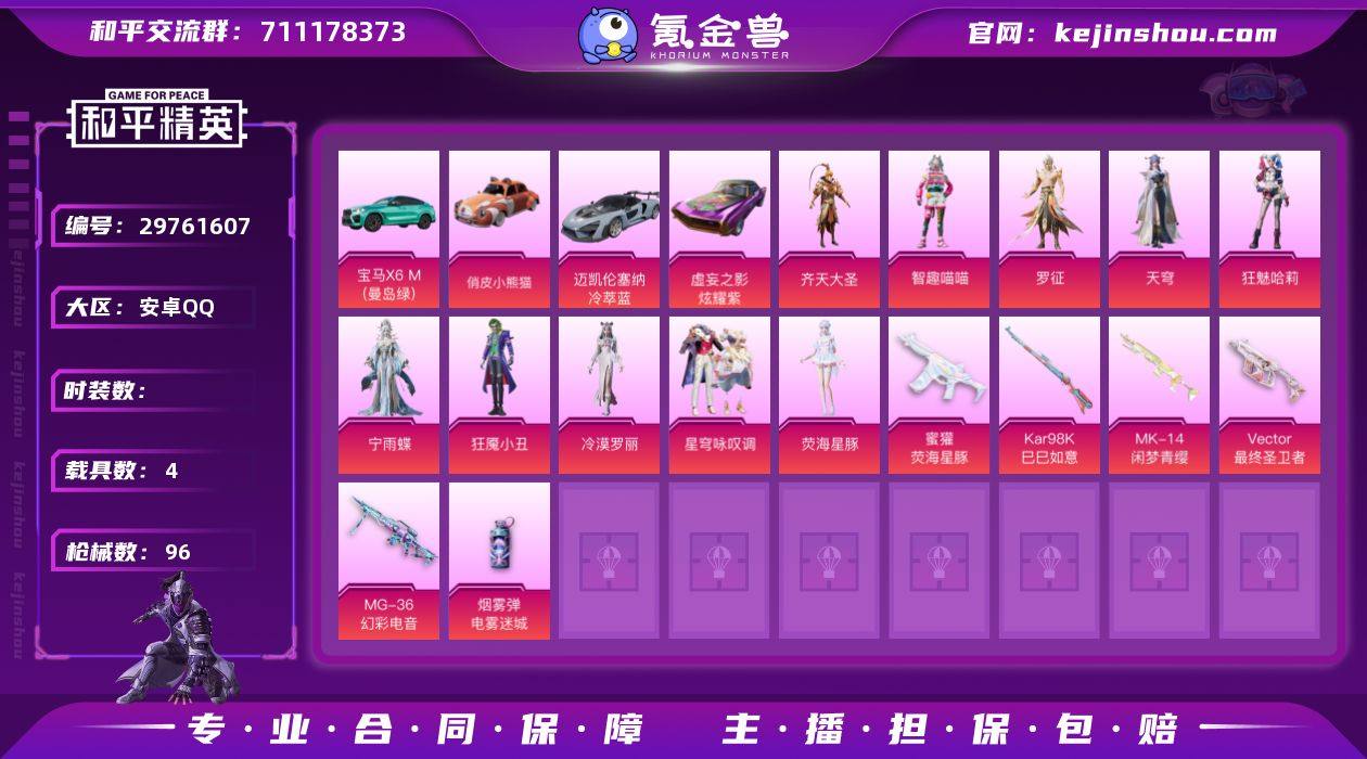 【4载具 6特效枪 11粉装 96枪皮 49套装】JQ#1神装10粉7枪4车8飞行器 最终圣卫者帕修斯 齐天大圣 狂魇小丑 宁雨蝶 冷漠罗丽 智趣喵喵 狂魅哈丽 罗征 天穹 荧星海豚 宝马X6 迈凯轮塞纳 虚妄之影 俏皮小奶喵 等等热门套装皮肤DMTQ4 1660,编号:WPXVB13