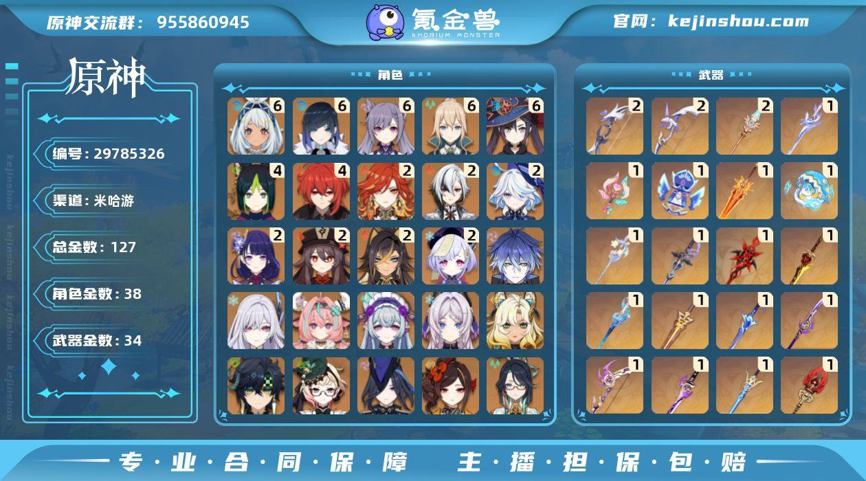 限定角色池垫72,武器池垫52,常驻垫65。建档全勤号,全四星图鉴,开服至今活动皮肤全收集,另有四个氪皮。有纪行名片和联动翅膀。头像框已拿到,主力全带专属套装毕业词条,T0多关键命座且全带专武,超高练度玛拉妮核爆已轻松超两千万伤,在成就可查,月卡还有两多月。