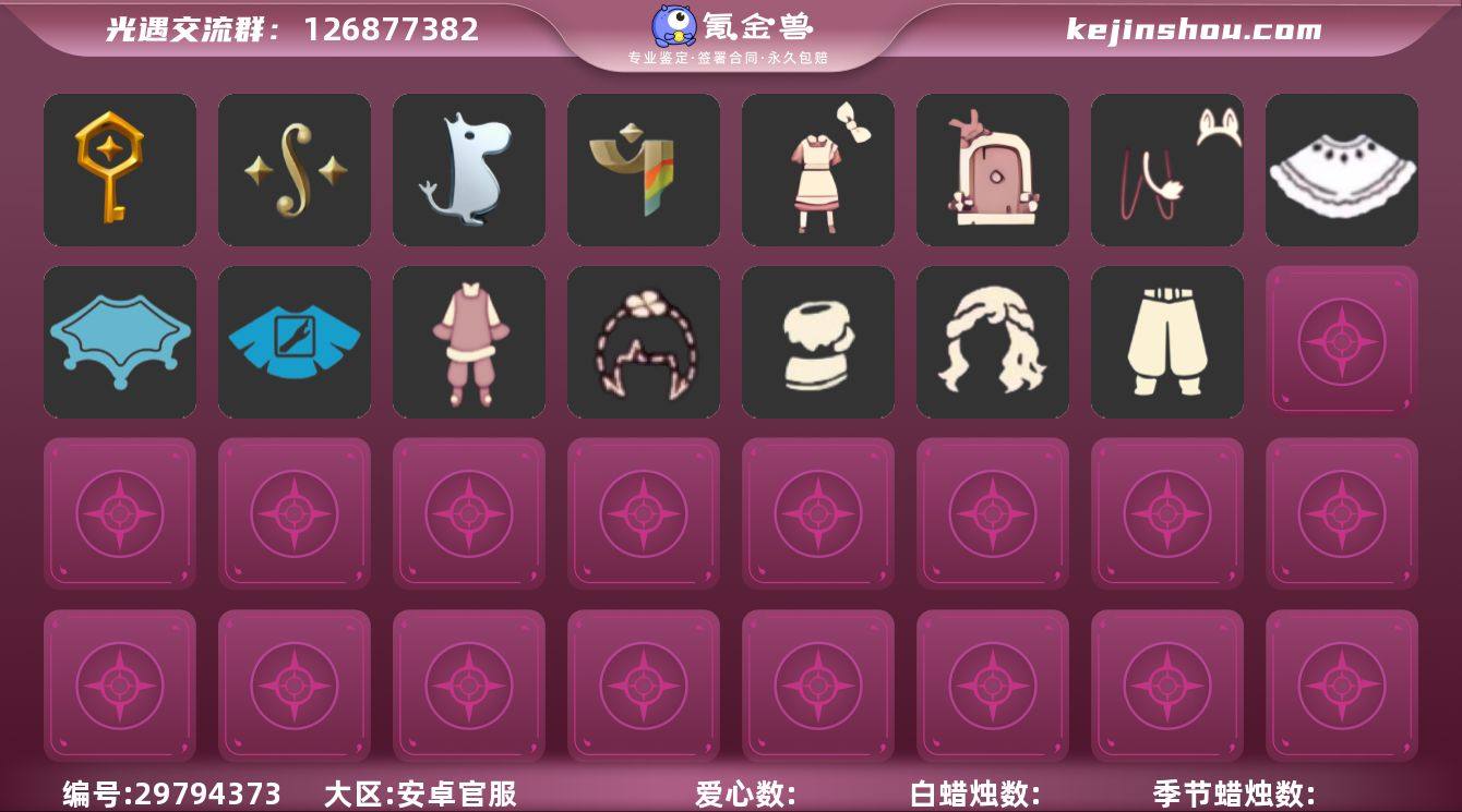 账号类型: 手机账号 季节已毕业: 归巢季,九色鹿季,筑巢季,二重奏季,姆明季,彩染季 完成地图: 雨林,霞谷 珍稀物品: 彩虹围巾 礼包: 蝙蝠套,巫师,欧若拉之翼,九色鹿角,莲花斗,绊爱,大耳狗发饰,人声乐器,橘子,红伞,兔子,彩虹耳机,四叶草,创始人,青衫落拓礼包 裤子: 武士裤,搓澡巾,妮妮裙子,飞天裤,筑巢季·裤子,青鸟尊贵蓬头裤子 面具: 辉光羚羊面具 面饰: 红耳机 发型: 归巢毕业发型,若笠,虚荣,飞天盘发 头饰: 蓝色音乐会,平顶帽 斗篷: 海洋斗,绿芽,彩染围巾斗篷 配饰: 雨伞,筑巢季·小手办,高音钢琴,姆明抱枕,小红伞,二重奏挂画 亮点: 【优质装备】:武士裤,青鸟尊贵蓬头裤子(蓝色燕尾服),归巢毕业发型(五塑彩羽发),筑巢季·小手办(光之子试衣),高音钢琴(白色高脚钢琴),妮妮裙子(妮妮长裙),姆明抱枕,小红伞(姆明红伞)(姆明大伞),彩虹围巾(五塑彩带斗),归巢季,九色鹿(九色鹿季),飞天裤(柔缎花边连)(九色鹿丝带裤),筑巢季,二重奏季,二重奏挂画(合奏挂画),姆明季,筑巢季·裤子(设计师长袍),辉光羚羊面具,彩染季,飞天盘发(九色鹿丸子头),蝙蝠套(蝙蝠斗篷)(南瓜头),欧若拉之翼,莲花斗(异彩莲花斗篷),绊爱(绊爱斗篷)(绊爱礼包),红耳机,九色鹿角(神鹿祝福头饰)(神鹿祝福礼包),大耳狗发饰(迷你大耳狗发饰),人声乐器(欧若拉之声),红伞(瑞气纸伞),巫师(巫师帽),雨林,霞谷,若笠(箬笠),彩虹耳机,创始人(创始人斗篷),青衫落拓礼包,兔子(玉兔头饰)(玉兔发饰)(兔子发饰),橘子(大橘大利),四叶草(四叶草头饰)