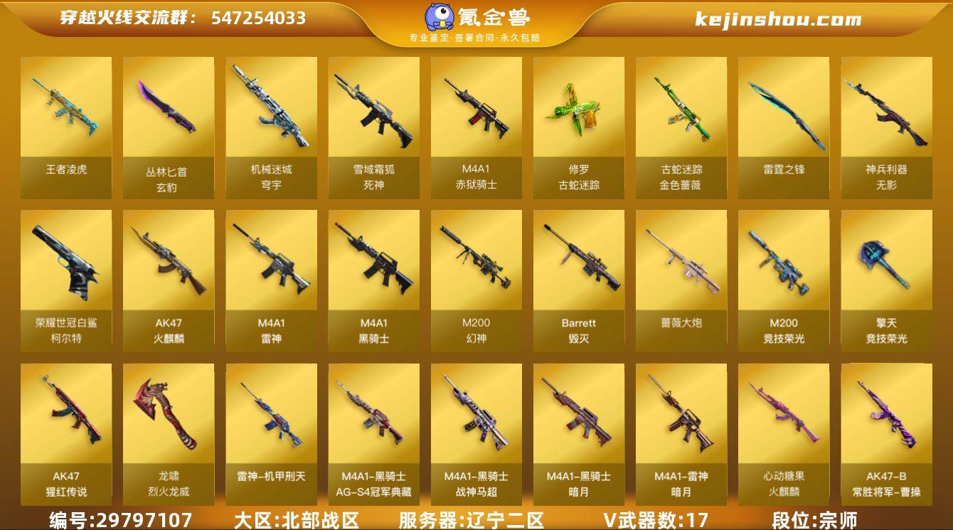 段位:宗师 VIP等级:VIP6 V武器数:17 王者武器数:1 王者凌虎 丛林匕首-玄豹,机械迷城-穹宇,死神-雪域霜狐,M4A1-赤狱骑士,修罗-古蛇迷踪,金色蔷薇-古蛇迷踪,雷霆之锋,无影-神兵利器,柯尔特-荣耀世冠白鲨2023,AK47-火麒麟,M4A1-雷神,M4A1-黑骑士,M200-幻神,Barrett-毁灭,蔷薇大炮,M200-竞技荣光,擎天-竞技荣光,AK-47-猩红传说,龙啸-烈火龙威 电竞教官-云悠悠 死神-雪域霜狐-怀旧音效卡,M200-幻神音效卡,M4A1-黑骑士音效卡