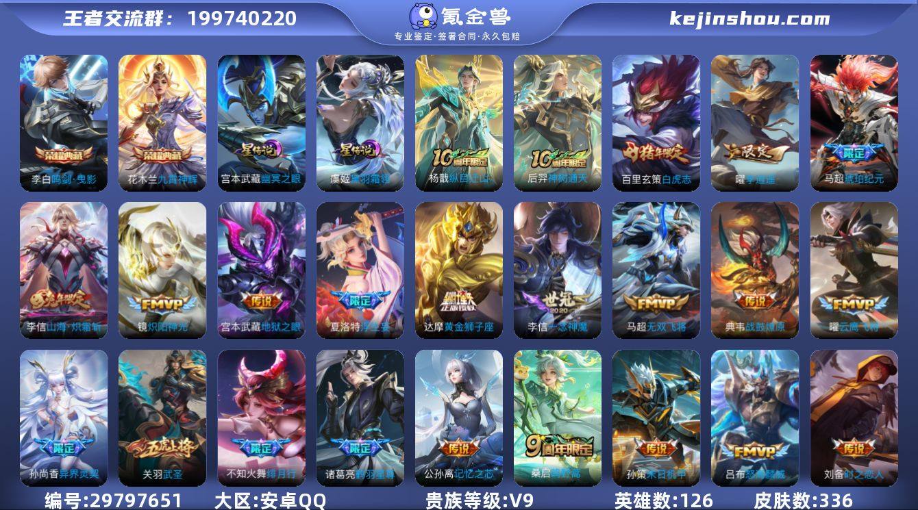贵族等级:V9 典藏皮肤数:2 珍品无双皮肤数:0 无双皮肤数:0 珍品传说皮肤数:0 传说皮肤数:28 史诗皮肤数:103 皮肤数:336 英雄数:126 段位:无双王者 卖家说:背包还有一颗荣耀水晶,还有5000多紫星币可以换星传说 对抗路47段