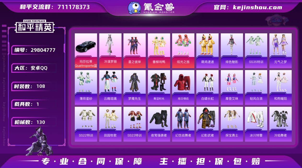 可改实名 1载具 4特效枪 4粉装 108套装 130枪械 玛莎拉蒂Quattroporte(夜幕蓝) M416-五爪金龙[7级] GROZA-旋转彩虹[7级] Kar98K-已已如意[5级] DP-28-豹影疾电[5级] 冷漠罗丽 -炫光之旅 星之彼岸 垂柳戏鸭 炫彩糖果 竞技名士 长空猛禽 云魄琉璃 一青年教官 特训学院 王牌印记8 热力值44084 K27347 和平精英买号永久包赔带二次营地ID:907605378
