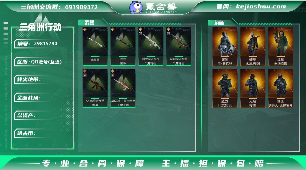 ABC9103/QQ区/可二次/钱包注销/【总资产:225.1M+近战北极星黑海+骇爪水墨云图+露娜黑天际线+蜂医送葬人无题密令+威龙壮志凌云+无名夜鹰+红狼电锯惊魂+深蓝不破誓约+K416突击步枪-命运(优品C)+QBZ95-1突击步枪-王牌之剑(优品C)+腾龙突击步枪-气象感应(优品C)+AUG突击步枪-气象感应(优品C)】哈夫币:948W,武器皮肤275;烽火60级:钻石Ⅰ,战场:军士长Ⅱ,【安全箱】基础安全箱;【特勤处等级】仓库LV.8,靶场LV.6,训练中心LV.7,收藏室LV.0,潜水中心LV.1;【捆绑包10】黑海捆绑包,北极星捆绑包,鹅鸭杀捆绑包,黑天际线捆绑包,电锯惊魂干员捆绑包,特斯拉线圈捆绑包,捞点薯条捆绑包,曙光捆绑包,蝮蛇捆绑包,禁卫捆绑包;【干员皮肤7】骇爪水墨云图,露娜黑天际线,蜂医送葬人无题密令,威龙壮志凌云,无名夜鹰,红狼电锯惊魂,深蓝不破誓约;【典藏皮肤】K416突击步枪-命运(优品C),QBZ95-1突击步枪-王牌之剑(优品C),腾龙突击步枪-气象感应(优品C),AUG突击步枪-气象感应(优品C);【近战皮肤】近战武器-黑海,近战武器-北极星,近战武器-黑鹰;【步枪皮肤】K416突击步枪-命运,QBZ95-1突击步枪-王牌之剑,腾龙突击步枪-气象感应,AUG突击步枪-气象感应,M4A1突击步枪-阿米娅,ASh-12战斗步枪-鹅鸭杀,AK-12突击步枪-夜鹰,AK-12突击步枪-特斯拉线圈,SCAR-H战斗步枪-启航,SCAR-H战斗步枪-水墨云图,SCAR-H战斗步枪-铁艺苍穹,G3战斗步枪-骑士,CAR-15突击步枪-阿米娅,CAR-15突击步枪-黑鹰坠落,腾龙突击步枪-捞点薯条,K437突击步枪-北极星,KC17突击步枪-电锯惊魂,M4A1突击步枪-特勤执行,AKM突击步枪-林中猎手,QBZ95-1突击步枪-曙光,QBZ95-1突击步枪-ACE,ASh-12战斗步枪-守夜人,ASh-12战斗步枪-无极限,M16A4突击步枪-竞赛选手,AUG突击步枪-战术迷彩,AUG突击步枪-蝮蛇,AUG突击...