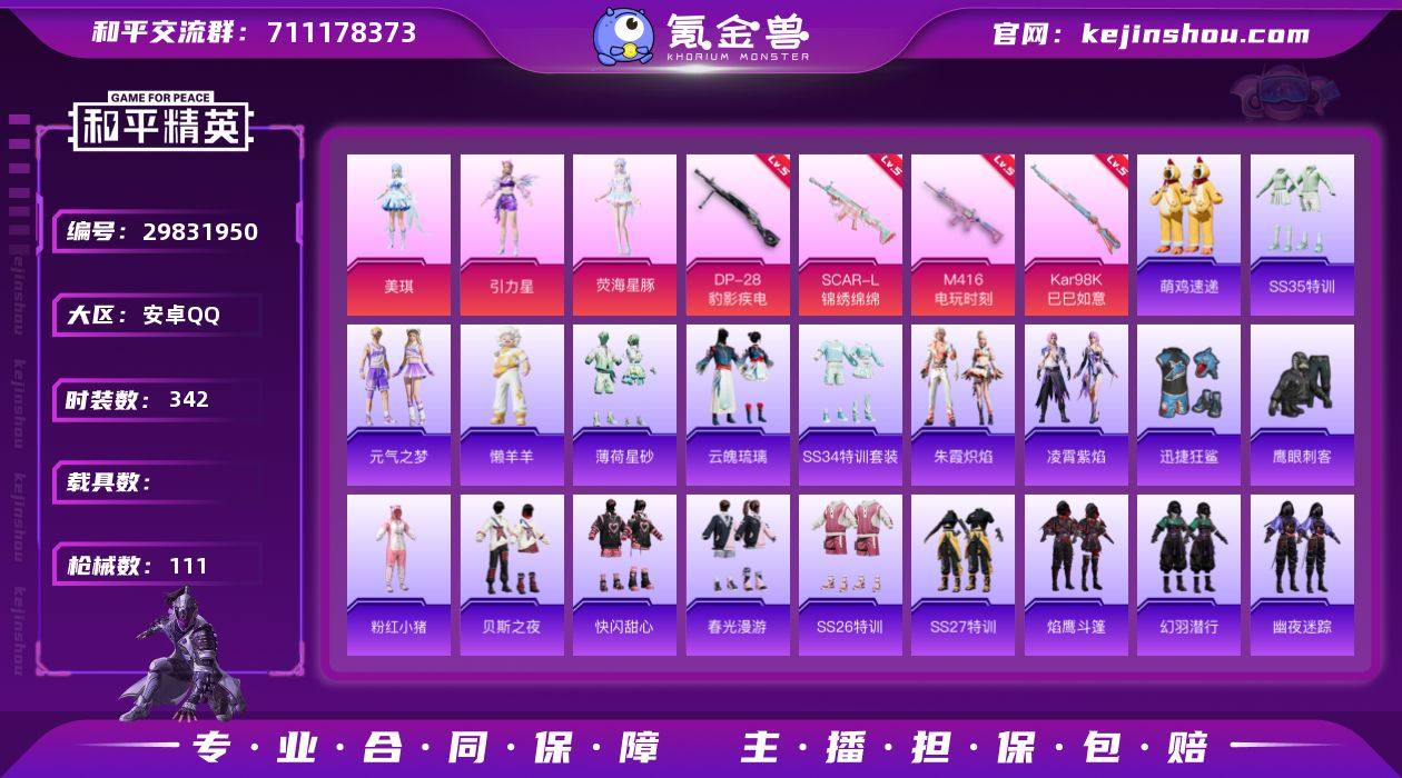 安卓Q-3粉装4特效枪10热门88套装111枪皮 33112热力值 6印记 历史传奇王牌16星 【3粉装】 美琪 引力星 荧海星豚 【4特效枪】 SCAR-L-锦绣绵绵 (5级) M416-电玩时刻 (5级) Kar98K-巳巳如意 (5级) DP-28-豹影疾电 (5级) 【10热门】 Mark.06(蓝螳螂) 龟仙人 晶辉守护 鹰眼刺客 迅捷狂鲨 粉红小猪 漫步者 破蛋小黄鸡 极速红龙 弄潮海豚 营地ID:958031071