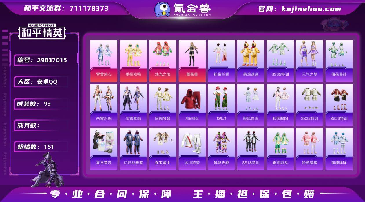 可改实名 5特效枪 4粉装 93套装 151枪械 4王牌印记 43888热力值 DP-28-豹影疾电[5级] MG-36-沧焰双生[5级] Kar98K-巳巳如意[5级] AKM-星际浪客[6级] Vector-环太平洋[5级] 蔷薇星 炫光之旅 垂柳戏鸭 雾雪冰心 凌霄紫焰 朱霞炽焰 银尘 海琴烟 K27472 和平精英买号永久包赔带二次营地ID:930182130