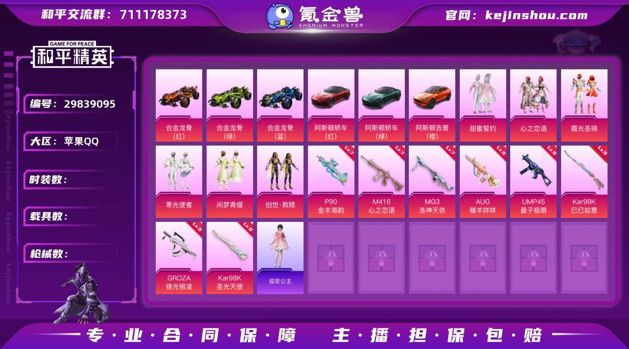 苹果 手Q-9粉装-12特效枪-1载具-1粉色飞行器-96019热力值-19王牌印记-209套装-303枪皮 【热门品类】:绝对防御上衣,套装-浪漫天命,套装-都市猎人,套装-胖达圆圆,套装-AG战队服,套装-龟仙人,套装-暗影哥特,套装-粉红小猪 【粉色套装】:粉装-天使彩虹糖,粉装-绚金战神,粉装-银刃赛罗,粉装-炙焰牛王,粉装-霁雪冰心,粉装-第五大道,角色-萨利娅,粉装-幻彩电音,角色-冰魄 【粉色枪皮等级】:AKM-梦之光华(七级),M416-五爪金龙(七级),M416-心之恋语(七级),GROZA-镜光银凌(五级),AUG-暖羊咩咩(五级),M762-鬼刀(七级),AKS-74U-森灵之息(五级),Kar98K-巳巳如意(五级),Mk14-甜梦熊击(五级),DP-28-豹影疾电(五级) 【粉色载具】:玛莎拉蒂Ghibli(粉) 【粉色枪皮】:AKM-梦之光华,M416-五爪金龙,M416-心之恋语,GROZA-镜光银凌,AUG-暖羊咩咩,M762-鬼刀,AKS-74U-森灵之息,Kar98K-巳巳如意,Mk14-甜梦熊击,Mk14-福马献瑞,DP-28-豹影疾电 【粉色飞行器】:千面幻镜飞行器 【粉色降落伞】:PEL轰鸣竞梦者降落伞,心之恋语降落伞,锦绣火鲤降落伞,荧光虫舞降落伞,阿狸红降落伞,香水柠檬降落伞,林间仙鹿降落伞,蓝莓炮弹降落伞,幻梦音符降落伞,筑梦精灵降落伞,炙焰牛王降落伞,彩虹甜喵降落伞,暗夜鎏金降落伞,飒粉甜心降落伞,精灵梦叶罗丽降落伞,鬼刀降落伞,智耀战神降落伞,幻彩电音降落伞 【稀有套装】:套装-龟仙人,套装-巳巳如意,套装-雏菊兔兔,套装-萝兰蝴蝶,套装-糖糖葫芦,套装-青团波波,套装-燕燕于飞,套装-鱼渊荷华,角色-风玲,角色-海琴烟,套装-紫幽梦,套装-蓝冰羽,角色-猎影月神,套装-极速光影,套装-书海巡游,套装-画境星梦,套装-琴音绮想,套装-雨过天青,套装-红釉青花 【稀有枪皮】:AKM-夜灯,AKM-彩虹符号,AKM-影袭,AKM-恐龙拽拽,AKM-江南烟雨,AKM-...