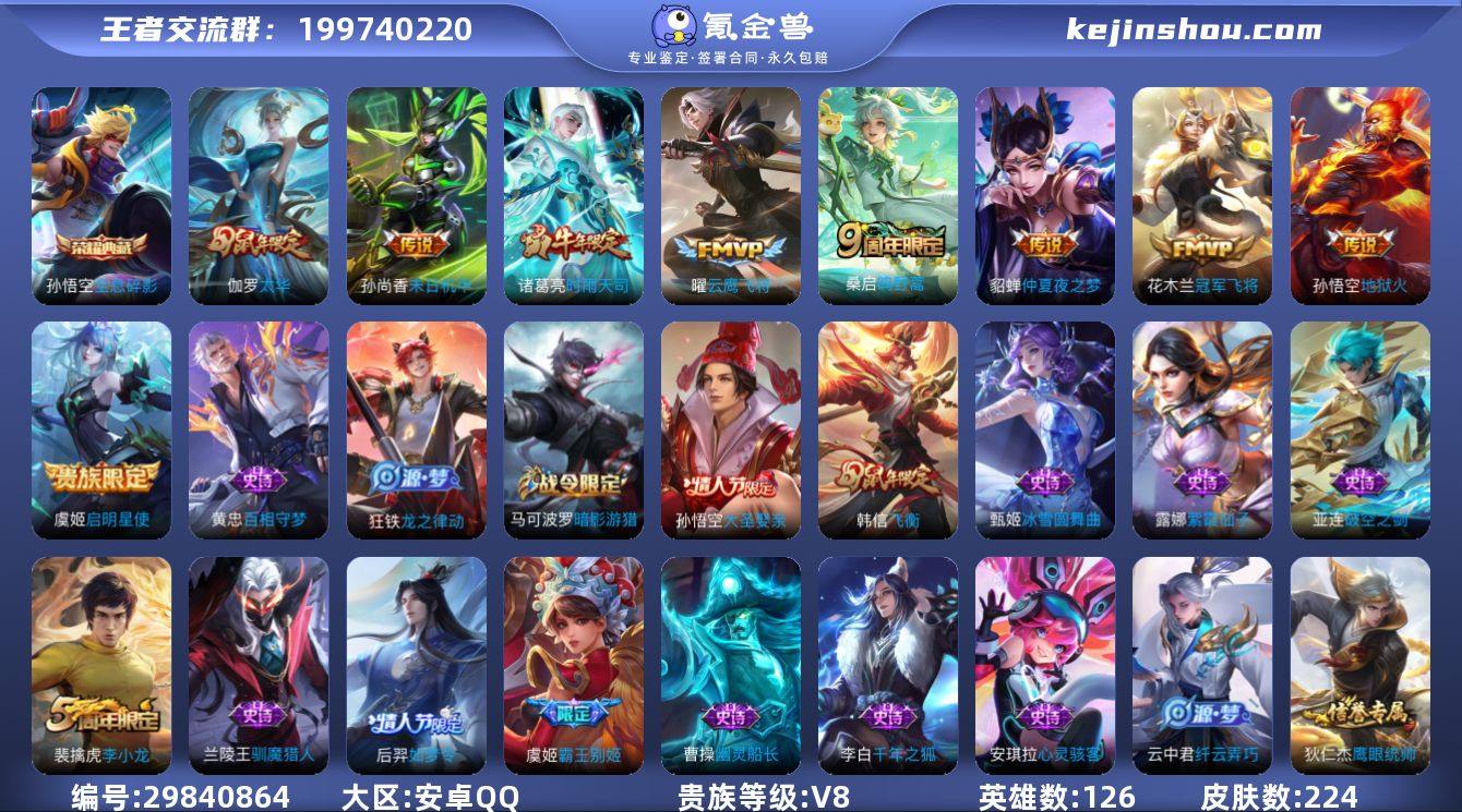 安卓Q-V6-至尊星耀II段位-127英雄-225皮肤-1典藏皮肤-8传说-60史诗 【英雄全皮】:孙权全皮,空空儿全皮 【荣耀典藏】:铠银白咏叹调 【传说皮肤】:澜逐花归海,诸葛亮时雨天司,镜炽阳神光,貂蝉猫影幻舞,干将莫邪久胜战神,梦奇胖达荣荣,后羿黄金射手座,宫本武藏地狱之眼 【限定皮肤】:虞姬夏日便利店,狄仁杰阴阳师,虞姬凯尔特女王,廉颇寅虎御盾,赵云皇家上将,孙尚香蔷薇恋人,庄周高山流水,高渐离玩趣恶龙,阿轲迷踪丽影,孙膑妖精王,扁鹊炼金王,元歌无心,夏侯惇朔风刀,甄姬游园惊梦,曹操烛龙,典韦蓝屏警告,马可波罗山海玄木吟,狄仁杰魔术师,狄仁杰万华元夜,达摩沙漠行僧,项羽海滩派对,老夫子醍醐杖,程咬金演武夺筹,露娜一生所爱,刘邦夺宝奇兵,韩信飞衡,兰陵王金庭之子,牛魔御旌,李元芳云中旅人,钟馗驱傩正仪,杨玉环寅虎心曲,雅典娜黎明之约,太乙真人饕餮,鬼谷子原初探秘者,鬼谷子五谷丰年,诸葛亮时雨天司,苏烈千军破阵,百里玄策原初追逐者,弈星混沌棋,梦奇顽趣,沈梦溪大漠名商,明世隐疑决卦,裴擒虎李小龙,裴擒虎擒涛扼浪,狂铁御狮,米莱狄御霄,云中君纤云弄巧,盾山御銮,猪八戒猪悟能,上官婉儿梁祝,嫦娥拒霜思,桑启海盐诗旅,艾琳女武神,鬼谷子天穹祈灯 【年限皮肤】:韩信飞衡,诸葛亮时雨天司,廉颇寅虎御盾,杨玉环寅虎心曲,马可波罗山海玄木吟 【赛季限定】:孙膑妖精王,扁鹊炼金王,虞姬凯尔特女王,太乙真人饕餮,曹操烛龙,狂铁御狮,米莱狄御霄,牛魔御旌,盾山御銮,夏侯惇朔风刀,弈星混沌棋,明世隐疑决卦,老夫子醍醐杖,鬼谷子原初探秘者,狄仁杰万华元夜,程咬金演武夺筹,钟馗驱傩正仪,苏烈千军破阵,达摩沙漠行僧,兰陵王金庭之子,沈梦溪大漠名商,李元芳云中旅人,桑启海盐诗旅,裴擒虎擒涛扼浪,鬼谷子天穹祈灯,太乙真人谧流熔炉...