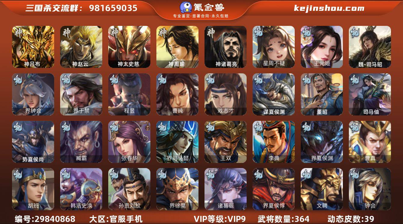 VIP等级:VIP9 官阶:大将军 史诗武将数量:39 动态皮肤数量:39 宝珠数量:0 将魂数量:4351