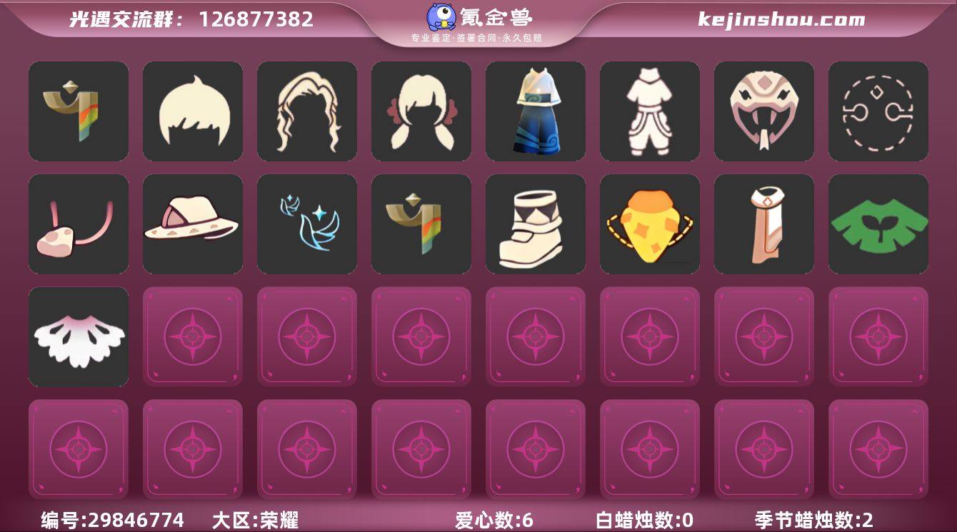 蜡烛数量:0 爱心数量:6 季节蜡烛数量:2 翼数量:6 彩染季 必胜客联动斗篷,彩染围巾斗篷,绿芽,樱花斗 正太,虚荣,樱花 海浪长裤,彩虹裤 蛇年面具,黑脸 必胜客联动面饰 必胜客联动礼帽 青鸟毕业项链,彩染季项链 彩染挑衅艺伎鞋子 青衫落拓礼包,粽子发饰礼包,暗彩装扮 卖家说:。