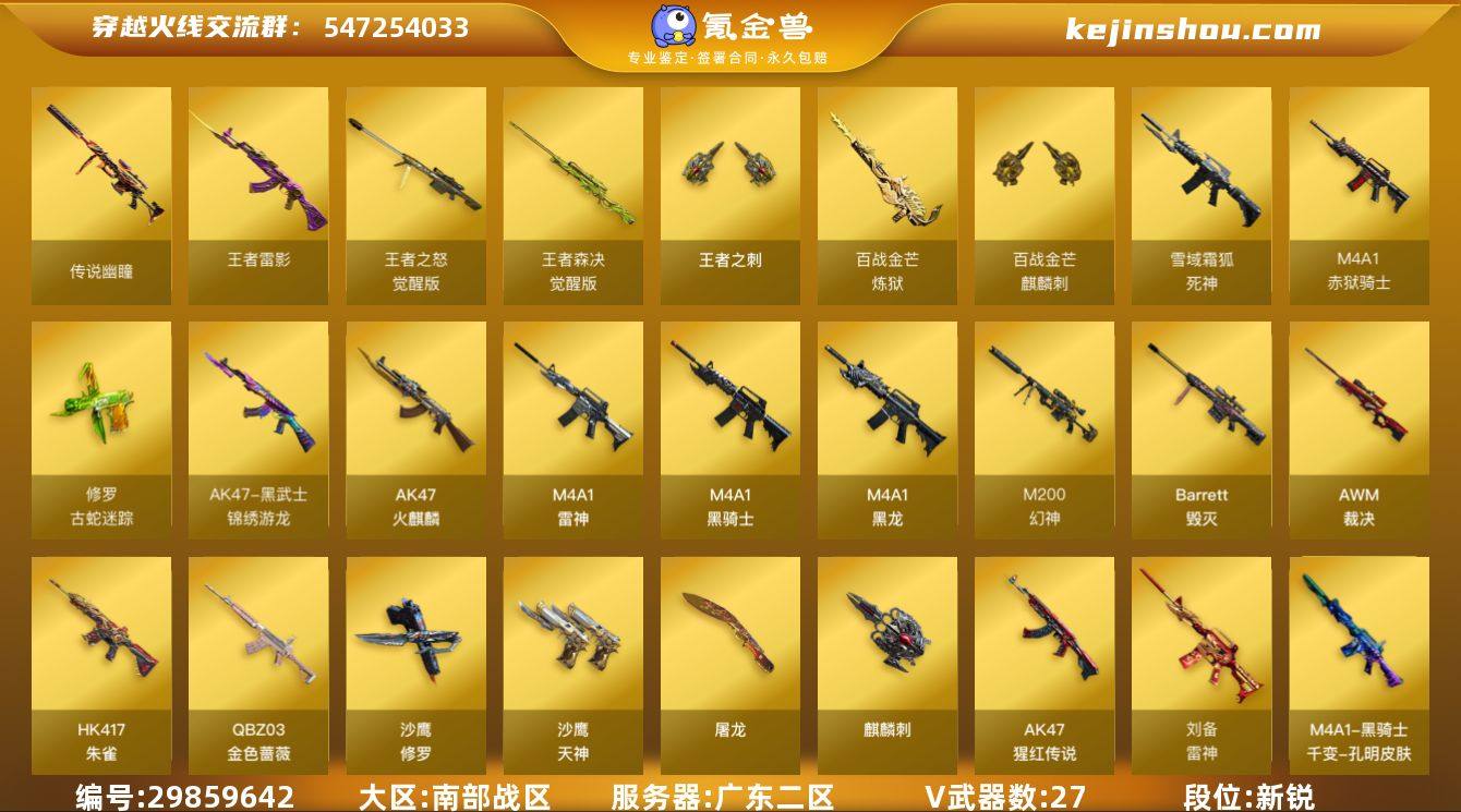 【双全号/传说幽瞳,QBZ03-金色蔷薇,HK417-朱雀,M200-幻神,修罗-古蛇迷踪,Cat-刀锋,毒蜂,M4A1-黑骑士,羊驼玩偶,沙鹰-修罗】广东二区-31V-12王者-0炫金 【传说武器】:传说幽瞳 【热门武器】:传说幽瞳,QBZ03-金色蔷薇,HK417-朱雀,M200-幻神,修罗-古蛇迷踪,Cat-刀锋,毒蜂,M4A1-黑骑士,羊驼玩偶,沙鹰-修罗 【王者炫金武器】:王者雷影,王者之刺 【音效卡】:M200-幻神音效卡,M4A1-黑骑士音效卡,Barrett-毁灭音效卡,Barrett-碧霄极光音效卡*3,炼狱-百战金芒-庆典舞曲音效卡,死神-雪域霜狐-怀旧音效卡 【皮肤】:M200-幻神-黄忠皮肤,幻神-周瑜皮肤,金色蔷薇-Heartshot皮肤,裁决-巅峰荣耀 皮肤,星神-漫游,M4A1-战神赵云,雷神-刘备 皮肤,雷神-源计划2.0专属 皮肤,雷神-诺拉 皮肤,M4A1-再燃火线,火麒麟-巅峰荣耀,毁灭-SV-CFPLS16冠军,毁灭-战神张飞,毁灭-定军扬威 皮肤,M4A1-千变-孔明皮肤,黑骑士-破界 皮肤,修罗-星空,屠龙-荣耀之锋,轻型军用手斧-再燃火线,麒麟刺-月皮肤 【角色】:电竞教官-云悠悠,雨墨,战地猎狐,王者樱-热浪之夏,王者晴雅,王者岚兮儿,雪域霜狐,蛇隐宗,奇洋探员,乔伊教练,云海玲珑,疾风,葵-赛博朋克,兰-海滩派对,兰妹妹,0号玩家,零-水下丽影,灵狐者-X,麻雀,曼陀罗-X,蛇姬,兔囡囡,维纳斯,夜玫瑰-宠粉,智影 【人偶武器】:Scar Light-马枪,COP-旗袍,Cat-刀锋,迷你牛牛,深渊终结者手雷 【暴走生化】:毒蜂,超级对讲机 【英雄级武器】:AK47-火麒麟,M4A1-黑龙,M4A1-雷神*2,M4A1-黑骑士,HK417-朱雀,黑武士-锦绣游龙,死神-雪域霜狐,QBZ03-独角-VI,QBZ03-金色蔷薇,AK-47-猩红传说,Barrett-毁灭,AWM-裁决,M200-幻神,王者之怒-觉醒版,王者森决-觉醒版,炼狱-百战金芒,炼狱-悦蓝-觉醒版,沙鹰-修罗,沙鹰-天神*3,修罗-...