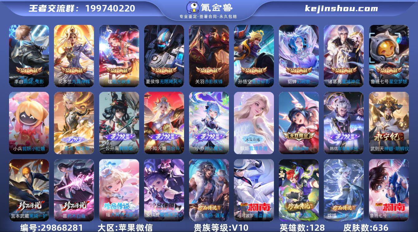 ON8628 苹果微信 V10 636皮 10典藏6星元 279限定105传说8无双9珍品传说 109按键2天幕 狐妖小红娘小兵 624个性戳戳 对抗路41段 全能大师 金标孙策/妲己/王昭君 2364英雄碎片 2669皮肤碎片 9张改名卡 27印记 7荣耀印记 营地号:454771500 【珍品传说】怪盗基德,孙策时之奇旅,江户川柯南,器灵·落星盏,兔狲·蓬尾,黑崎一护,朽木白哉,酷洛米之心,大耳狗之梦,【无 双】花合斗,韩信群星魔术团,真我赫兹瑶,时之魔女,神器·明辉仪,离恨烟,甄姬雪境奇遇,器灵·螭龙剑,【荣耀典藏】九霄神辉,赤影疾锋,全息碎影,鸣剑·曳影,星域神启,武则天,无限飓风号,星空梦想,幻阙歌,拾光映像,【星元皮肤】金色仲夏夜,幻海之心,未来机甲,时之思念,无限倾慕,岁雨灵司,【热门限定】愿照·众生和,愿照·岁时盈,愿照·千秋盛,愿照·山河定,愿照·九州拓,愿照·福禄聚,器灵·浮梦炉,逐花归海,凤求凰,至尊宝,乘龙·聚宝船,白虎志,青龙志,朱雀志,瑞麟志,玄武志,神威,虎魄,龙胆,烈魂,武圣,李逍遥,冰锋战神,千劫归真,天魔缭乱,白鹤梁神女,影龙天霄,如梦令男,异界灵契